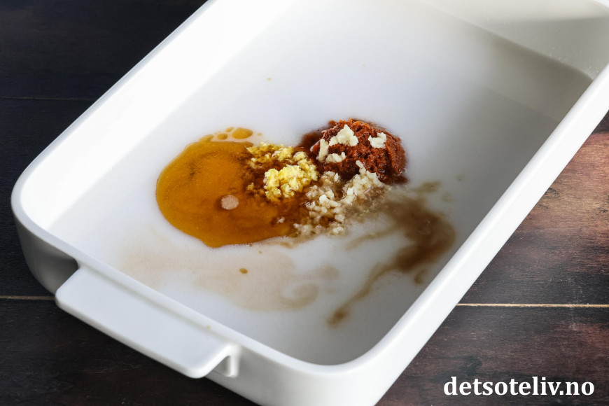 ♥ Jeg har her brukt thailandsk rød curry paste, som er lett å få tak i. Du kan alternativt bruke koreansk, fermentert rød chilipaste: gochujang.