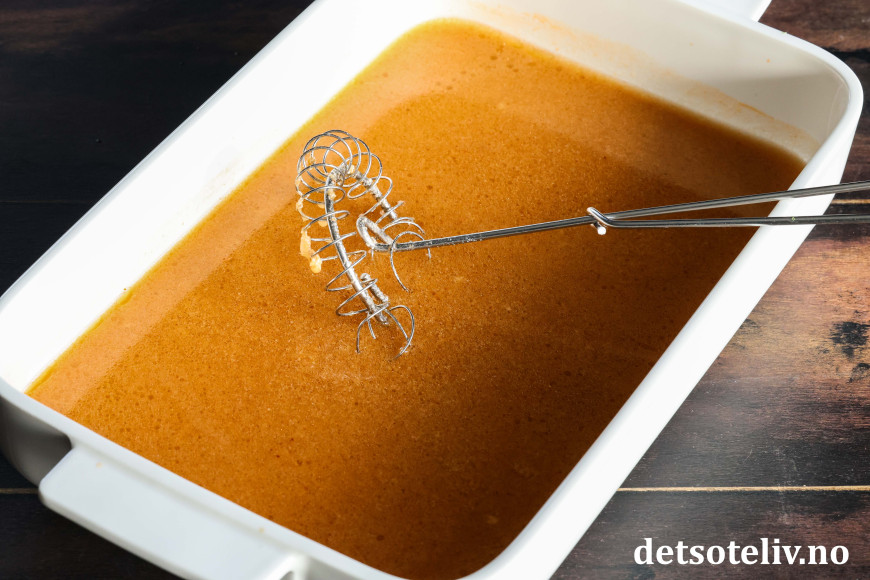 Ha kokosmelk i formen og tilsett også de øvrige ingrediensene til currysausen. Visp sausen raskt sammen.