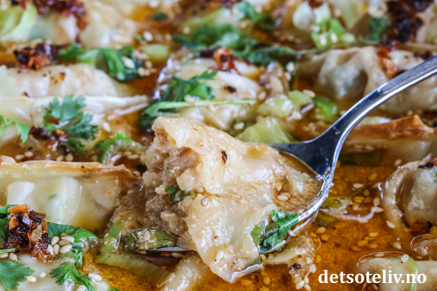 Dryss over kuttet vårløk, sesamfrø og frisk koriander. Bruk en teskje til å ha over litt chili crisp hvis du liker det.