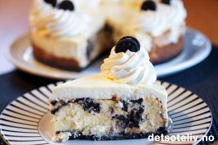 Ta kaken ut av ovnen og dryss over grovt hakkede Oreokjeks. Hell forsiktig over resten av ostemassen. Stek kaken videre midt i ovnen ved 220°C i 15 min til. Skru så varmen på ovnen ned til 100°C og flytt kaken til nederste rille. Stek kaken videre i 50 min til.