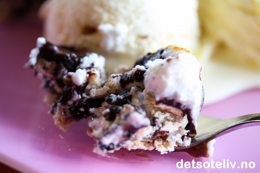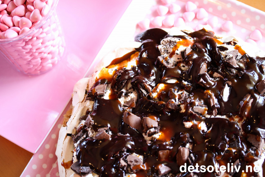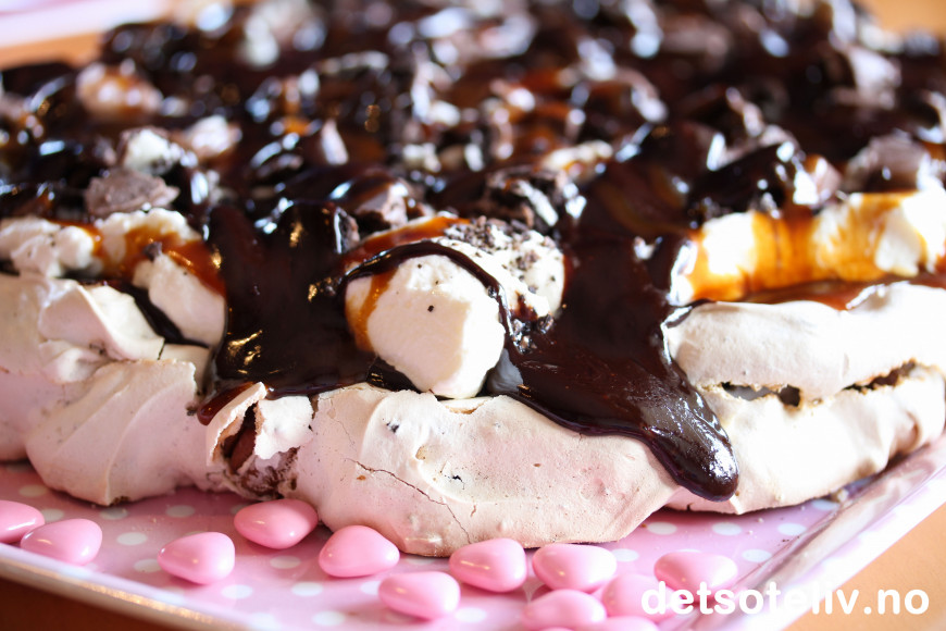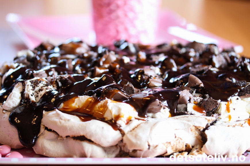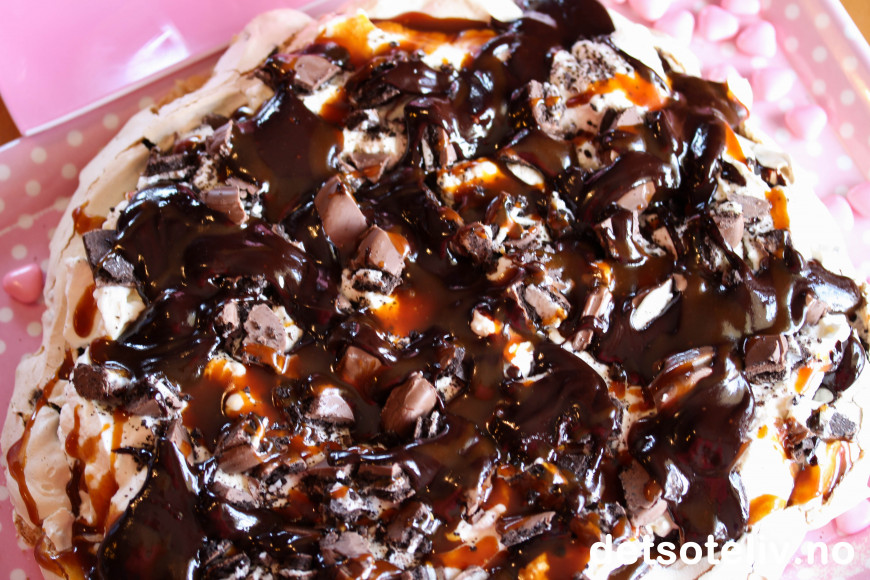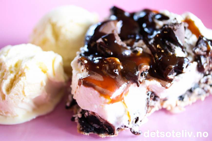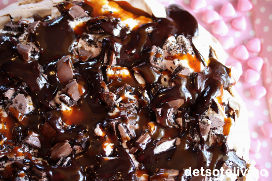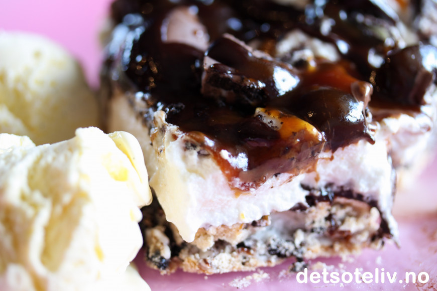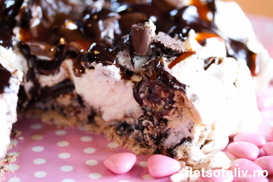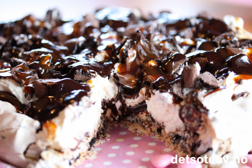 Dette er marengsbunn med Oreokjeks og pekannøtter, som er dekket med pisket krem, som er dekket med mer Oreos, som er dekket med sjokoladesaus, som er dekket med karamellsaus....