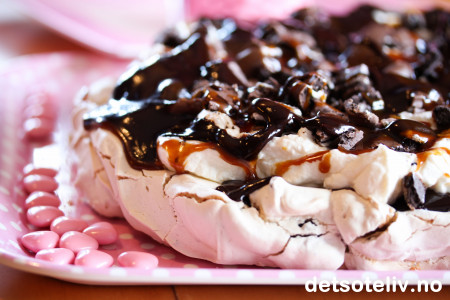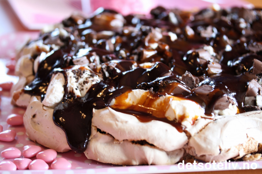 ♥ Det går fint å lage både marengsbunnen, sjokoladesausen og karamellsausen dagen i forveien, og sette kaken sammen med kremfyllet på serveringsdagen. Oppbevar både marengsbunnen og sausene i romtemperatur. Alternativt kan sausene også settes i kjøleskapet og der kan de oppbevares i mange dager, men vær forberedt på at de vil stivne i konsistensen om de står i kjøleskapet. Sausene blir imidlertid flytende igjen om du setter dem en liten stund i mikroen.