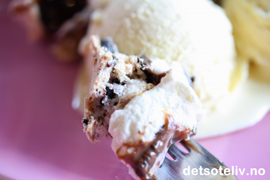Ringle så over rikelige mengder med sjokoladesaus og karamellsaus!