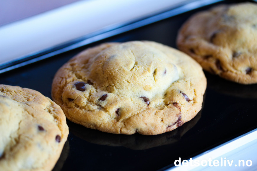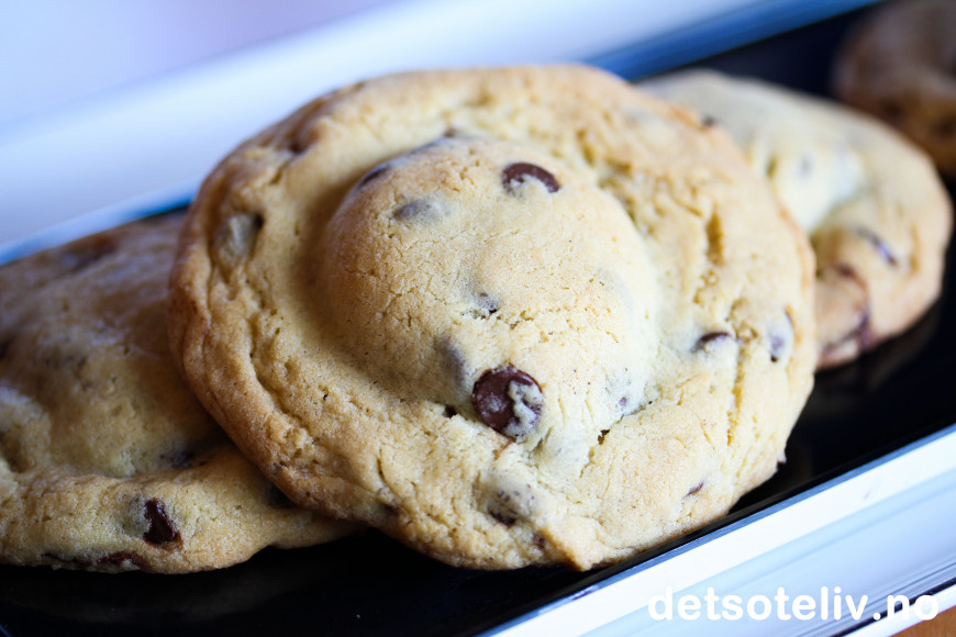 Pisk smør med brunt og hvitt sukker til smørkrem. Pisk inn eggene og vaniljeekstrakten. Bland mel og natron og rør det i til en jevn deig. Tilsett chocolate chips (eller grovhakket kokesjokolade) til slutt.