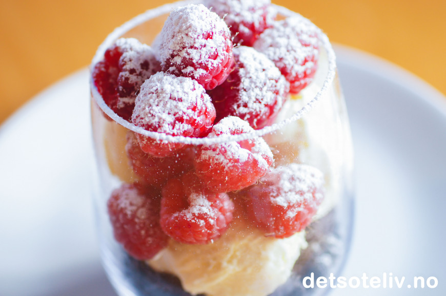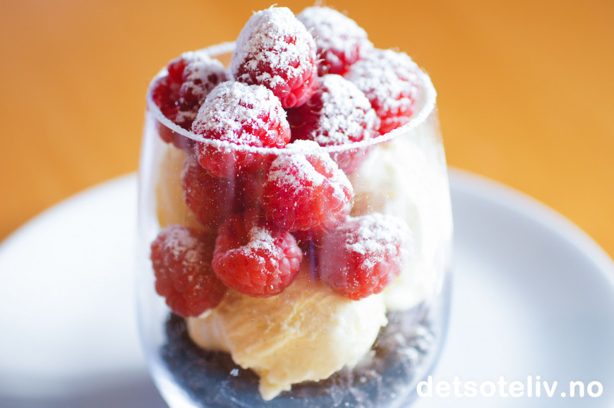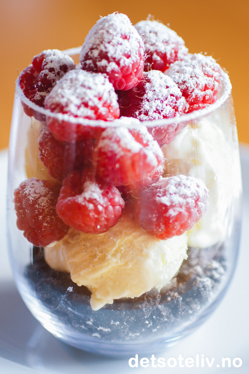 Legg på vaniljeiskremen. Dekk med bringebær og gi det hele et melisdryss til slutt.