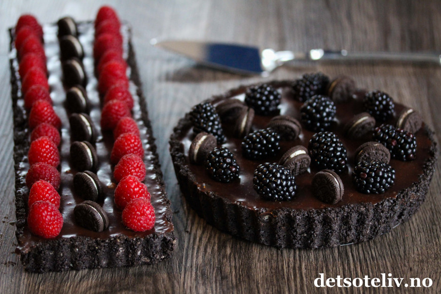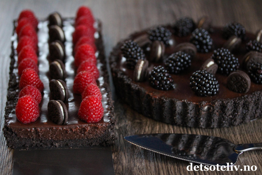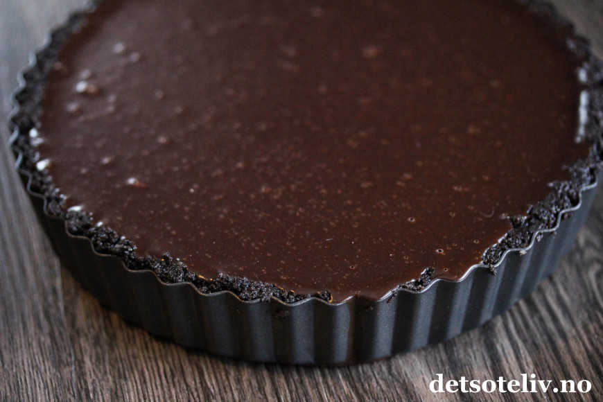 ♥ Som nevnt ovenfor kan du bruke både rund og avlang terteform. Størrelsen du må ha på formen for å få plass til alt sjokoladefyllet avhenger av hvor høye kanter det er på formen. Jeg brukte rundt form som var 22 cm i diameter, men den hadde høye kanter, så hvis din form er lavere, må du bruke form på 24 cm. Den avlange formen jeg brukte (standard størrelse er ca. 11 x 35 cm), ble litt for liten til å få plass til alt sjokoladefyllet. Du må selvsagt slutte å fylle formen før det renner over.