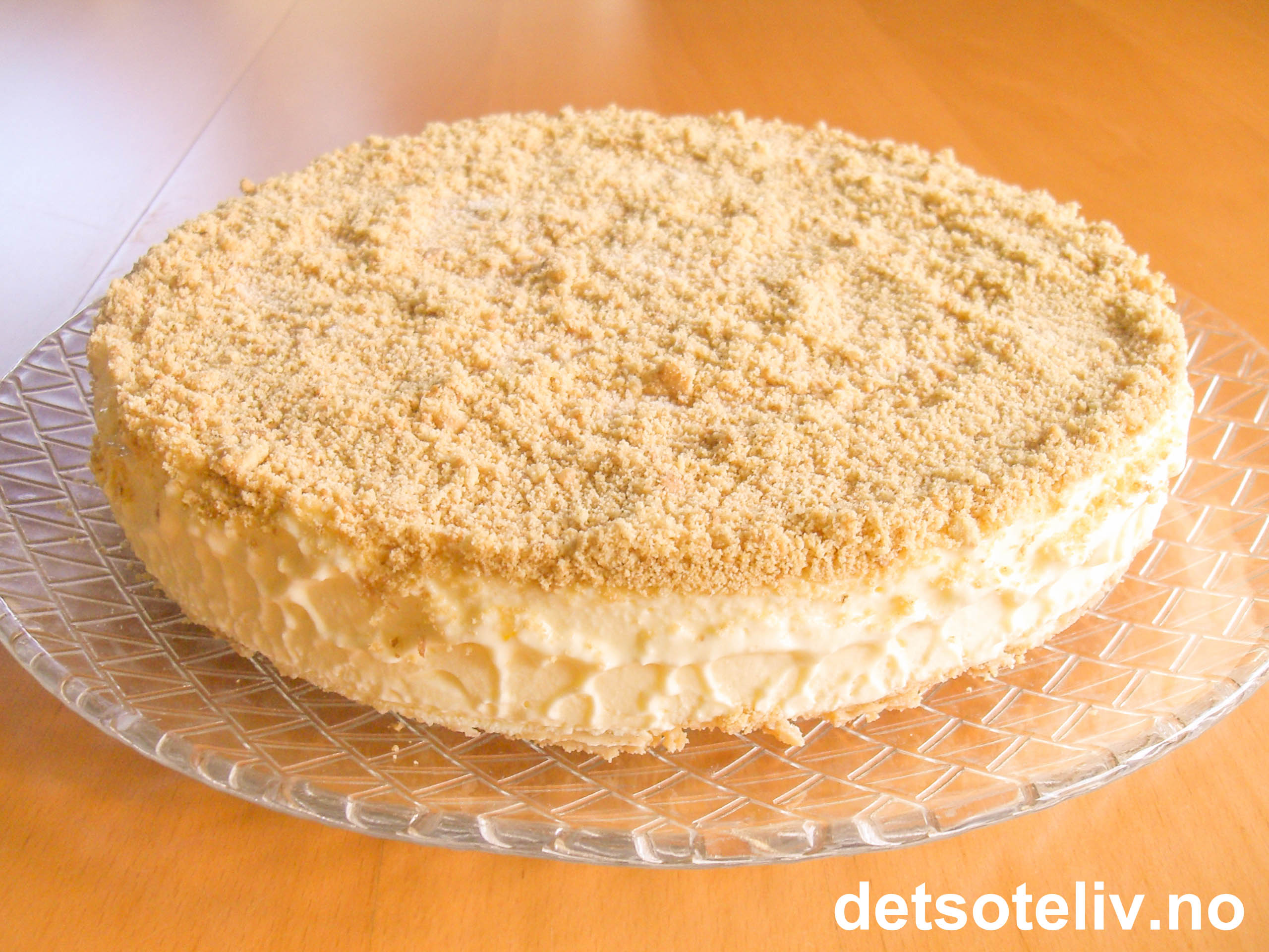 Bland halvparten av kjekssmulene (fra ca. 5 kjeks) med smeltet smør og ha i bunnen på en liten, rund form (22 cm i diameter). Sett formen i kjøleskapet.