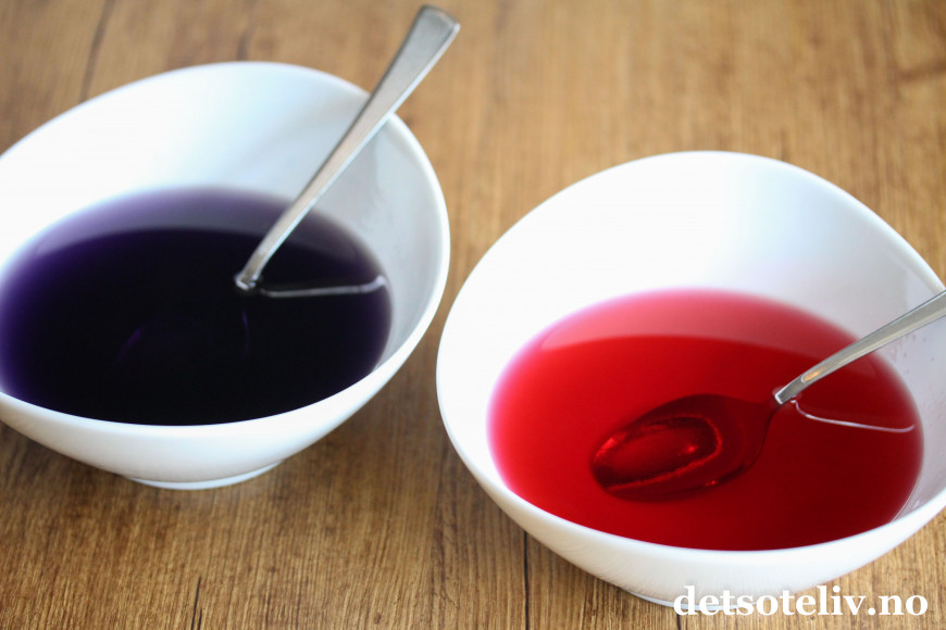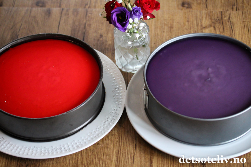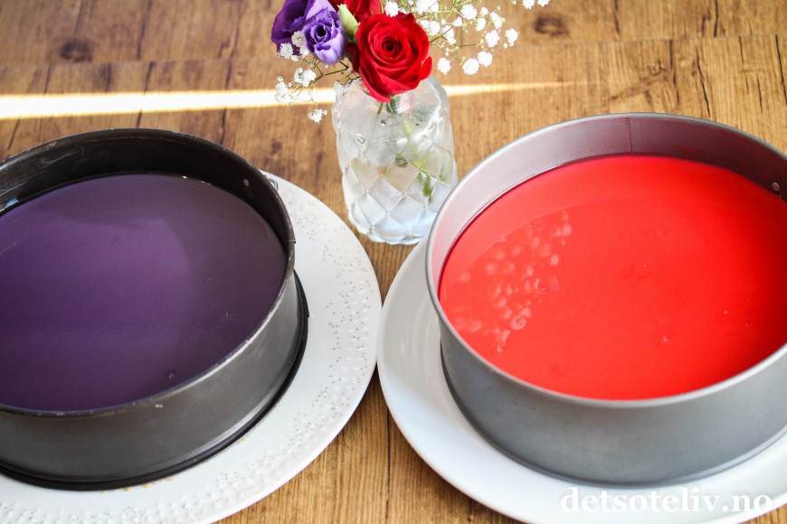 (Siden jeg her lager to ostekaker, lager jeg både rød og blå gelé også i denne runden.)