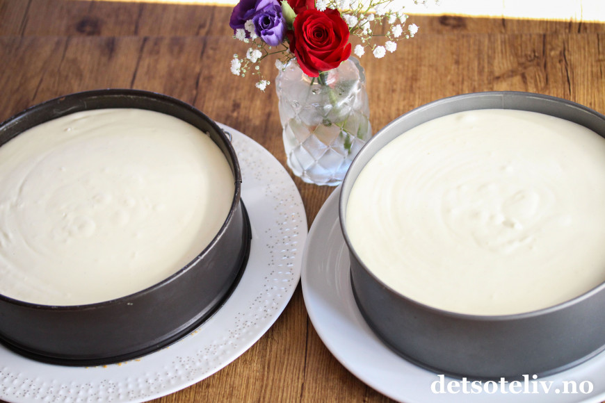 Sett nå formen i kjøleskapet (ikke fryseren) og la kaken stå der over natten.