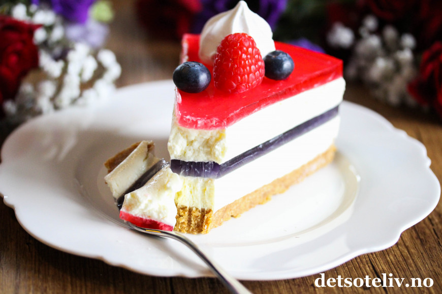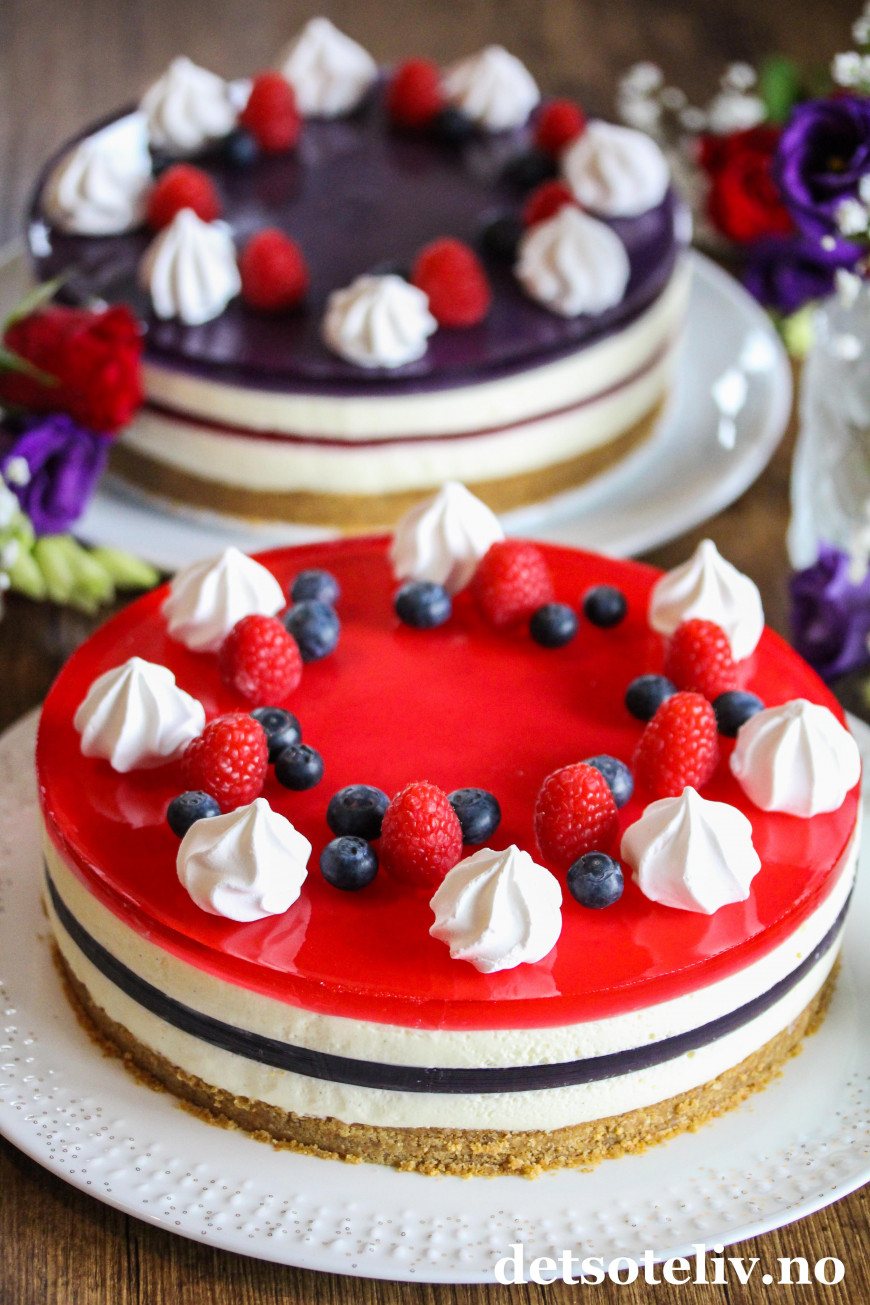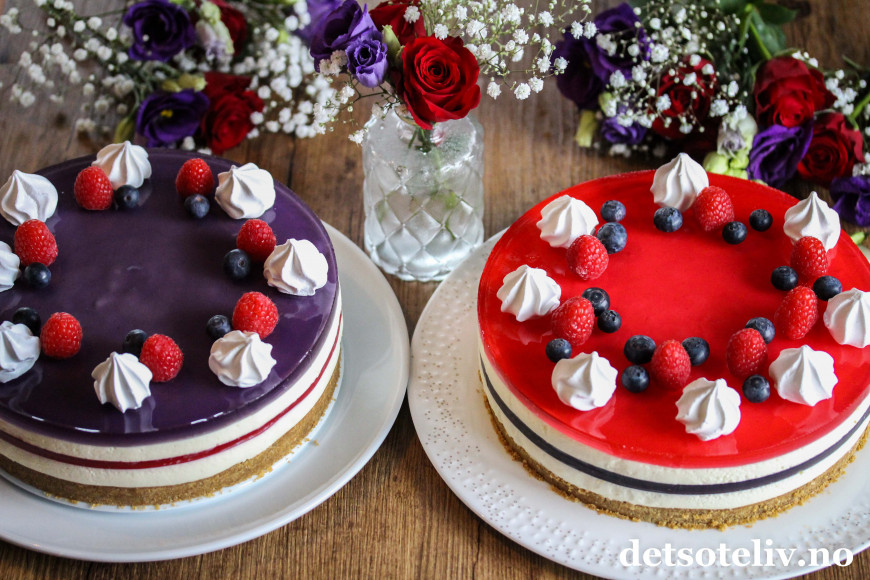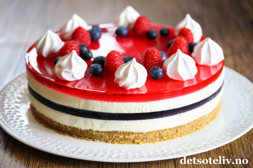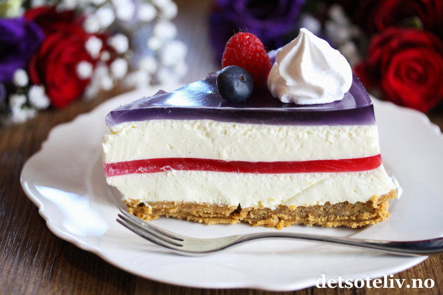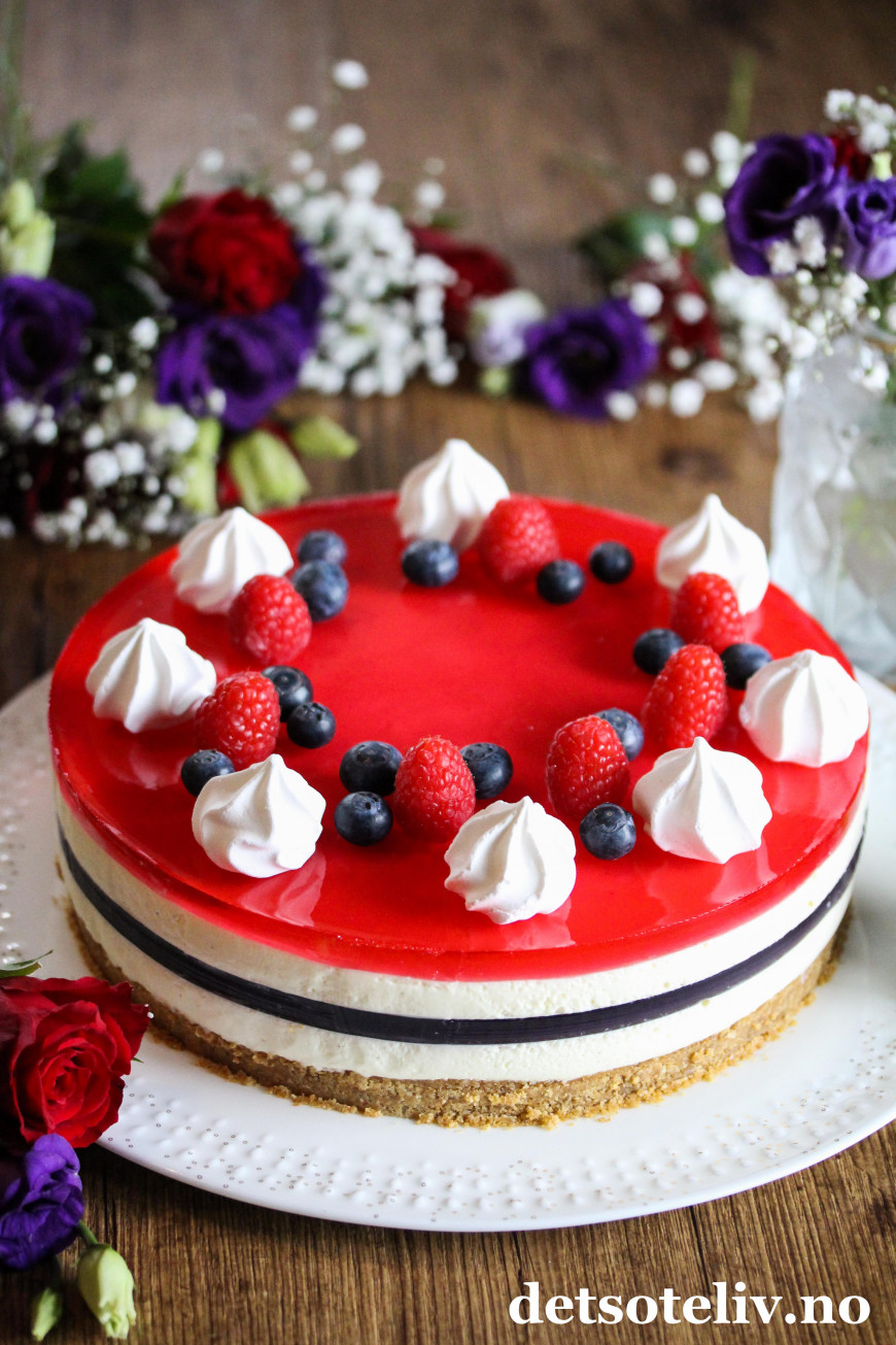 Her har jeg laget en vri på den klassiske ostekaken ved å lage både et lag rød gelé og et lag blå gelé. Sammen med den hvite ostefromasjen gir dette en lekker ostekake i rødt, hvitt og blått som passer perfekt å servere på 17. mai!