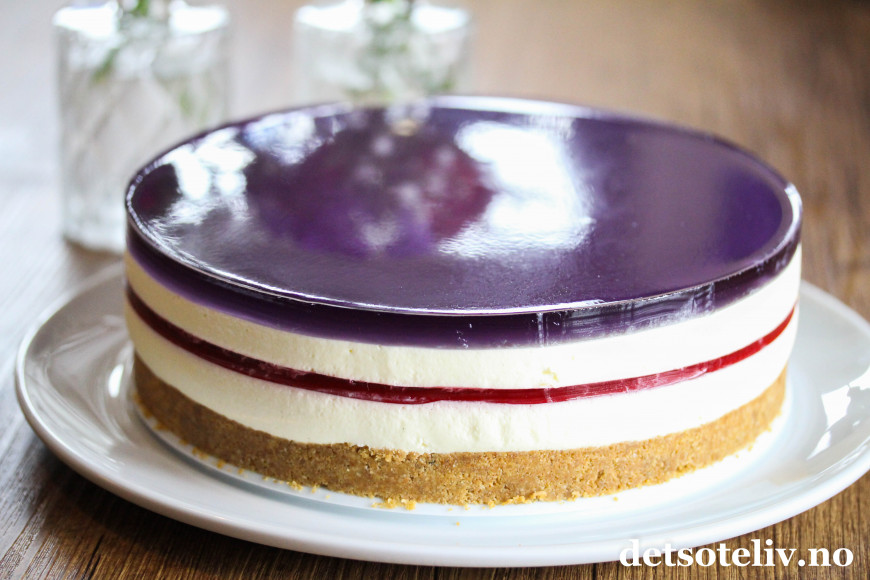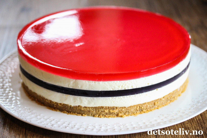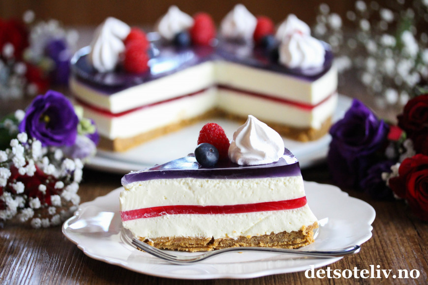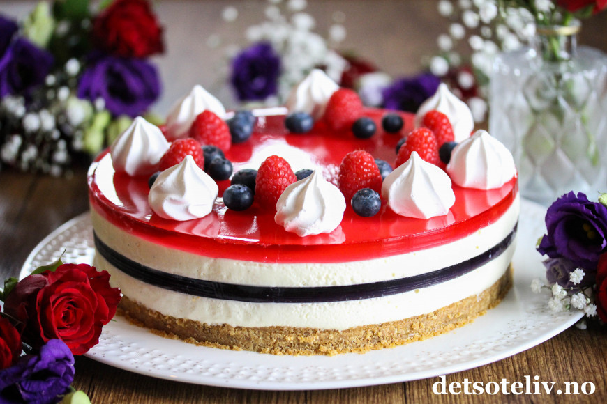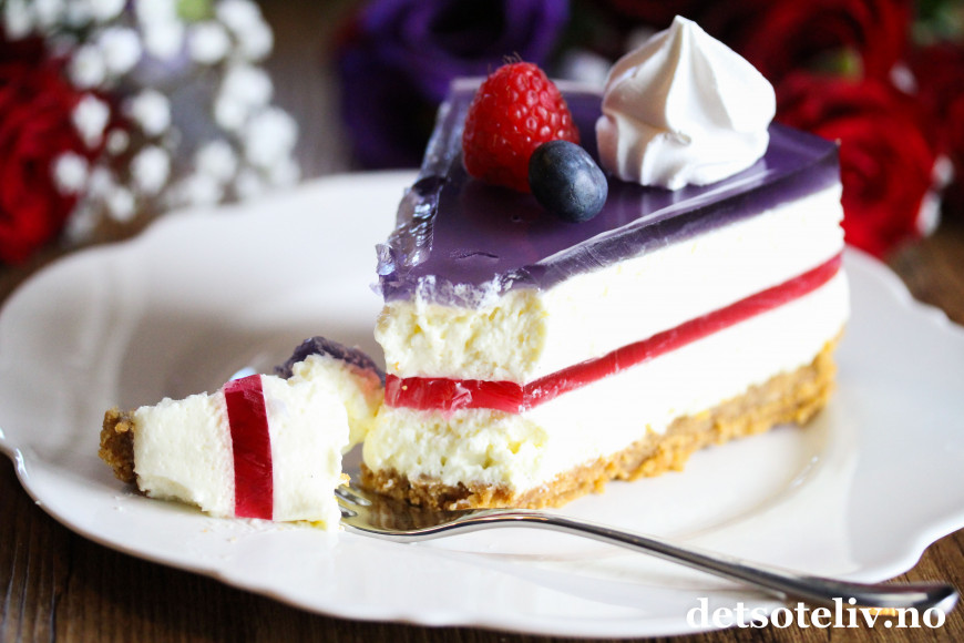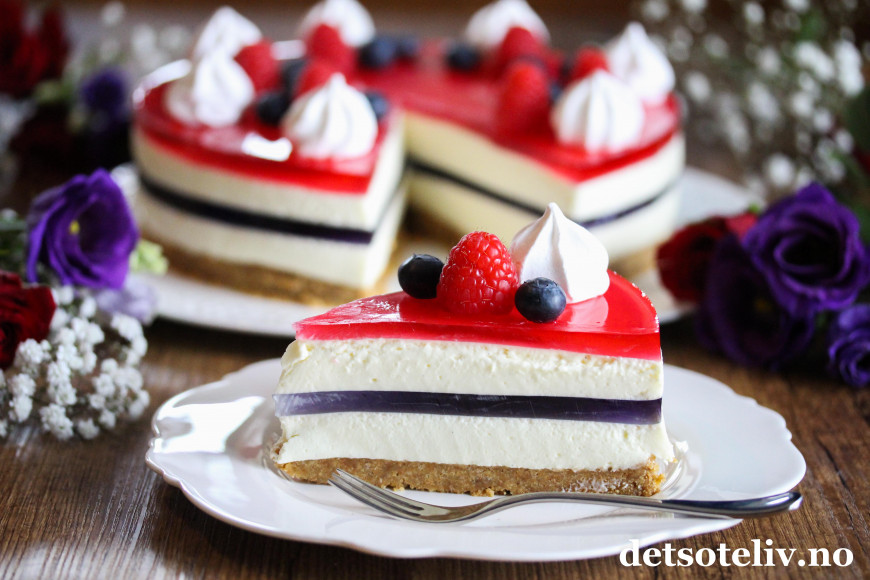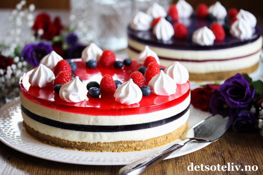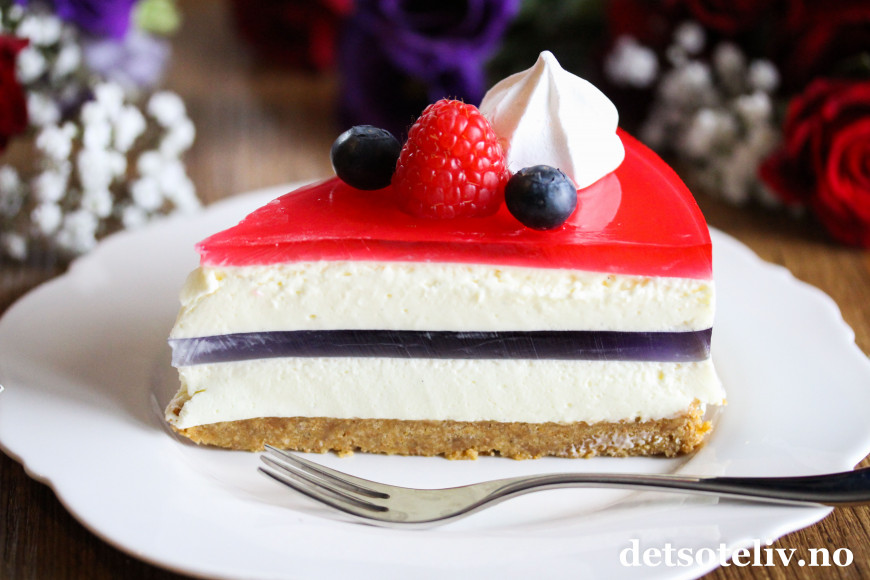 Her har jeg laget en vri på den klassiske ostekaken ved å lage både et lag rød gelé og et lag blå gelé. Sammen med den hvite ostefromasjen gir dette en lekker ostekake i rødt, hvitt og blått som passer perfekt å servere på 17. mai!