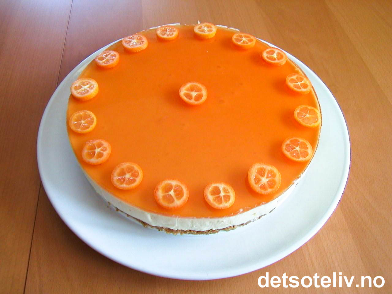 Løs opp appelsingelépulveret til topplokket i kokende vann. Avkjøl til den er kald, men fortsatt flytende. Hell i formen og sett kaken tilbake i kjøleskapet til gelélokket har stivnet. Skjær forsiktig langs kakeringen med en kniv og fjern kakeringen. Pynt med kumquat i skiver.