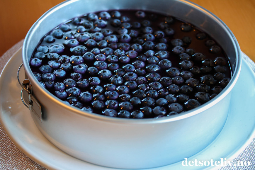 Kok opp vannet og løs opp blåbærelépulveret i vannet. Avkjøl til geléen er kald, men fortsatt flytende. Hell den så forsiktig i formen over blåbærene. Sett kaken tilbake i kjøleskapet til gelélokket har stivnet.