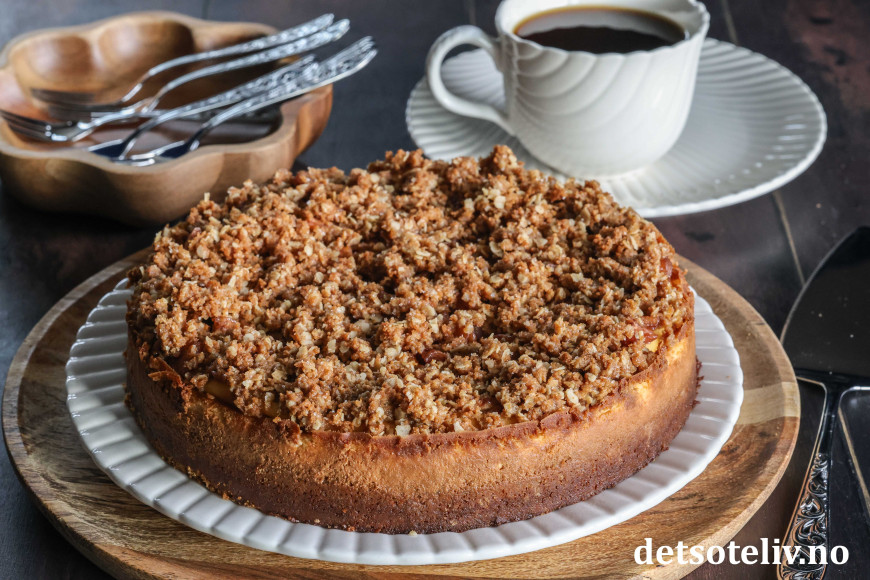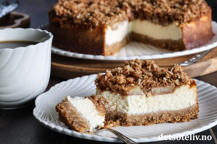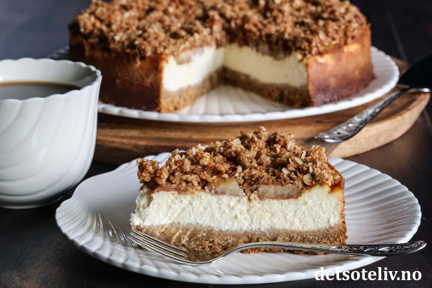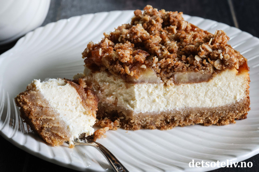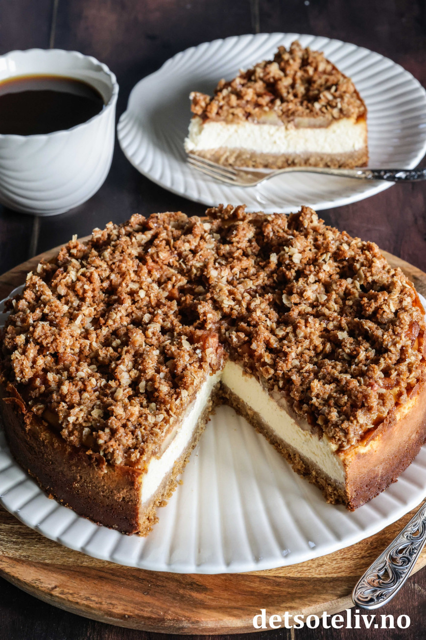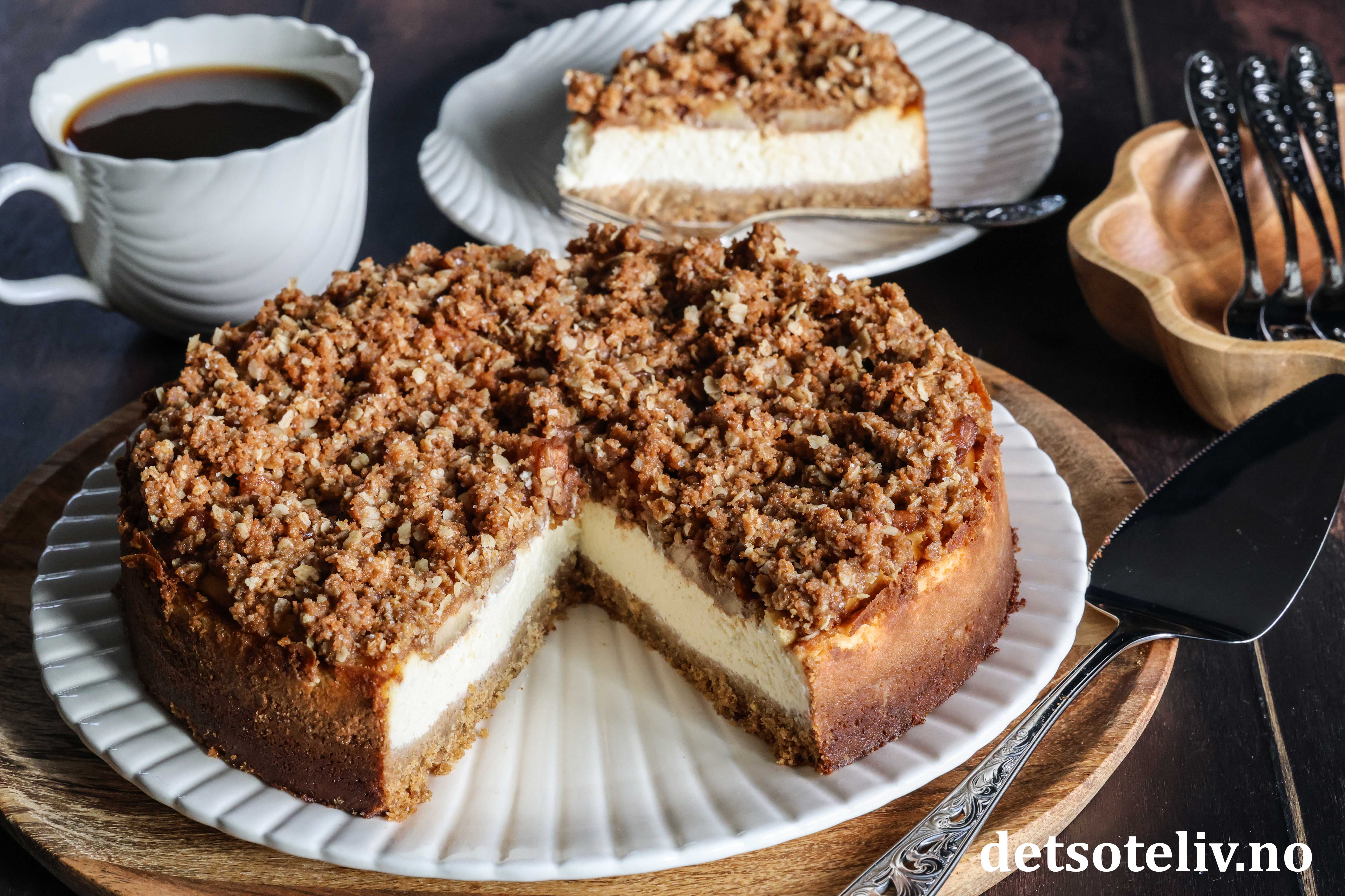 Dette er en kremete og fyldig, ovnsbakt ostekake (Cheesecake) som toppes med smørstekte eplebiter og en crunchy smuldretopping.