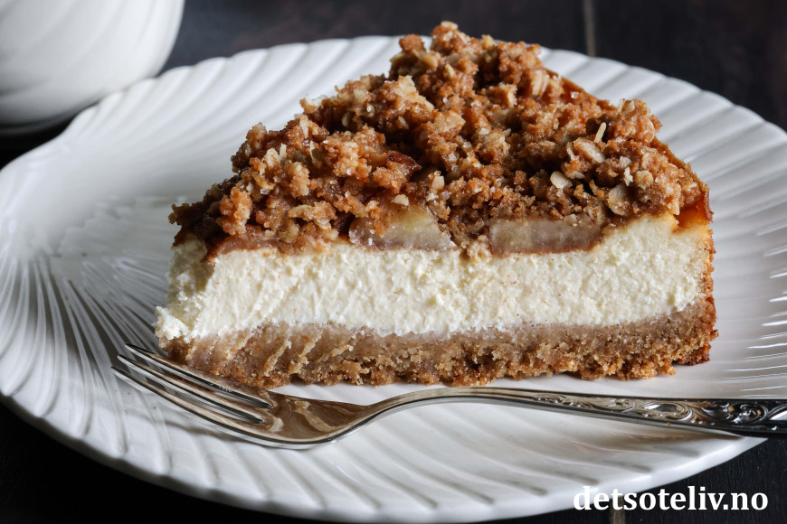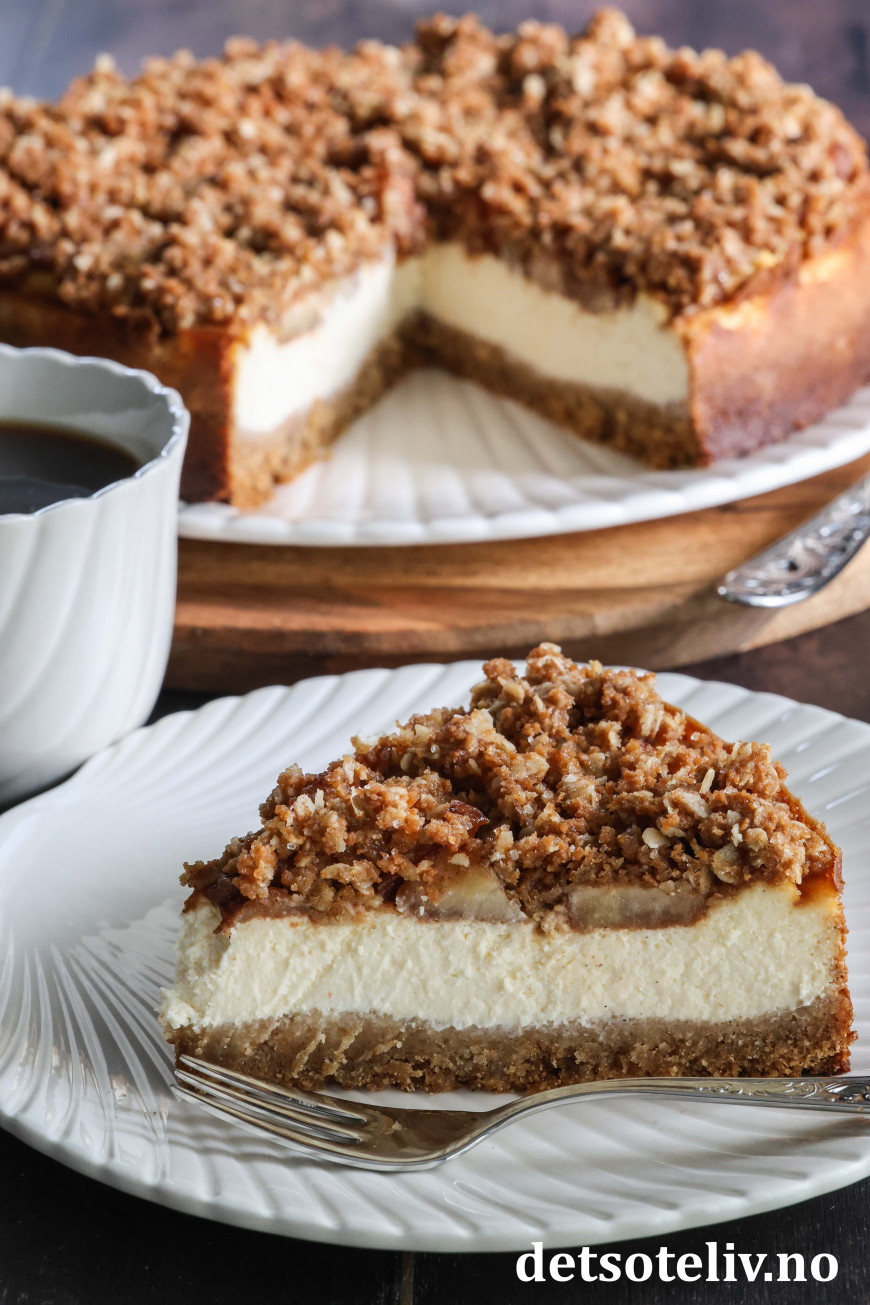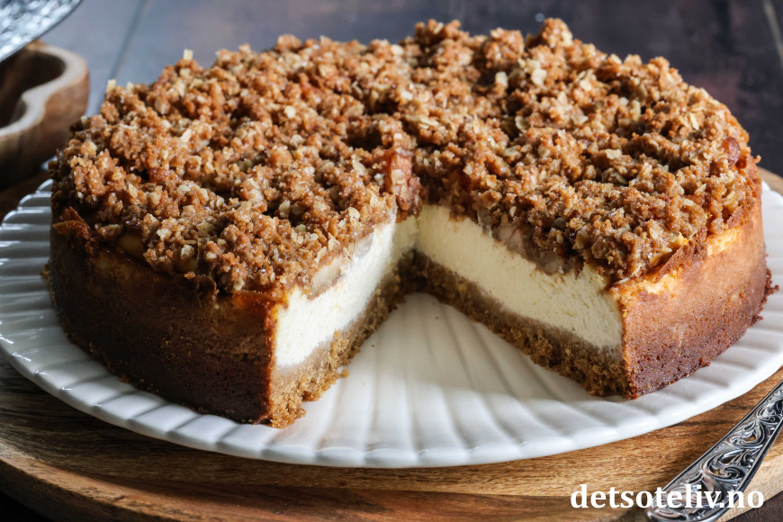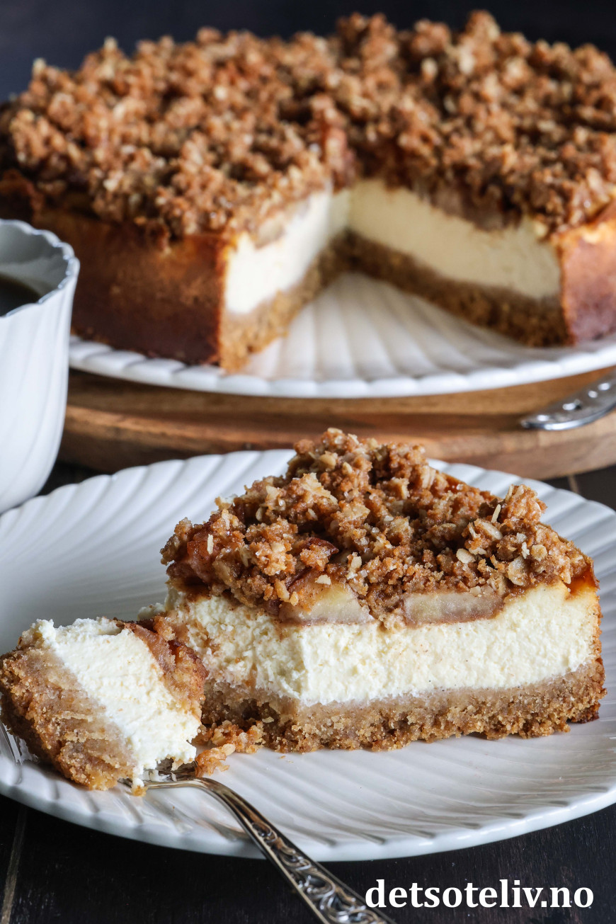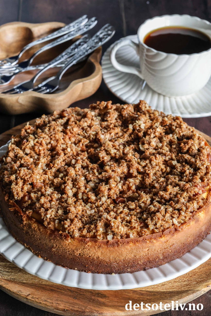 Dette er en kremete og fyldig, ovnsbakt ostekake (Cheesecake) som toppes med smørstekte eplebiter og en crunchy smuldretopping.