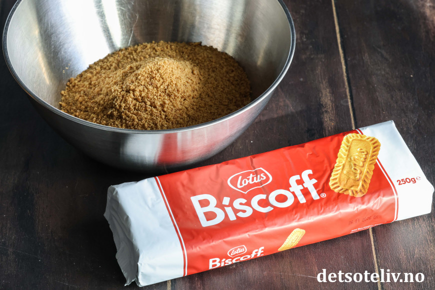♥ Jeg har her brukt Lotus Biscoff kjeks, men det går også helt fint å bruke Digestive-kjeks, Bixit eller andre varianter av søt havrekjeks til denne kaken. Knuste pepperkaker er et annet alternativ. En pakke Lotus Biscoff kjeks inneholder 250 g, så du kan eventuelt redusere mengden kjeks i kjeksbunnen til 200 gram, så trenger du bare å kjøpe 1 pakke.