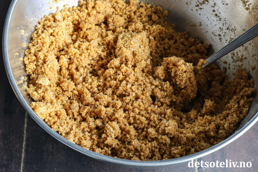 Knus kjeksene i en food processor. Ha kjekssmulene i en bolle sammen med havregryn, sukker og mykt, romtemperert smør.
