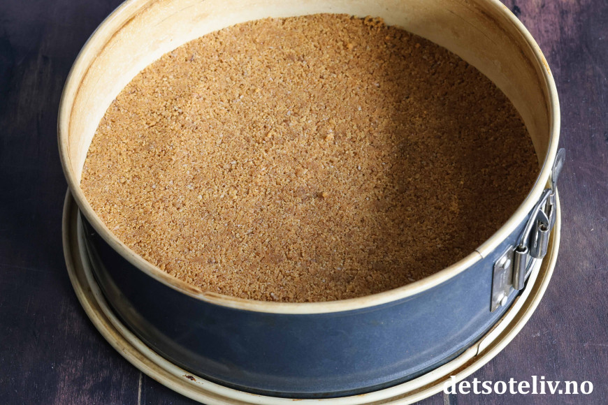 Ha bakepapir i bunnen av en springform (24 cm i diameter). Ha kjekssmulene i formen og press kjeksmassen utover med baksiden av en skje så du får en jevn kjeksbunn.