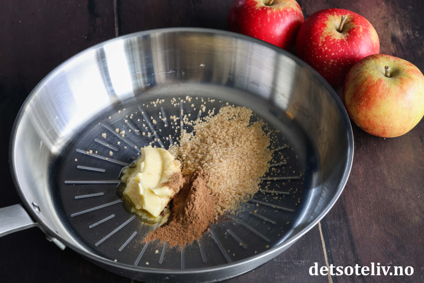 Finn frem epler. Ha sukker, kanel og smør i en stekepanne.