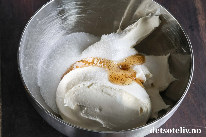 Ha kremost, sukker og vaniljepasta i en bolle. Pisk dette sammen til en jevn ostekrem.