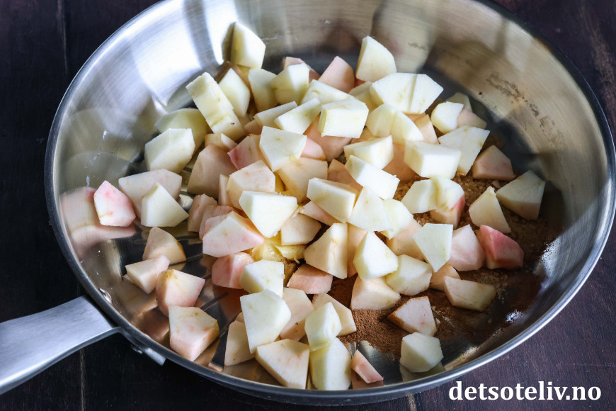 Skrell og rens eplene og skjær dem opp i terninger. Ha eplebitene i stekepannen.