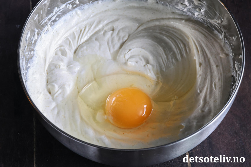 Pisk dette sammen til en jevn ostekrem. Pisk inn eggene, ett om gangen (se tips).