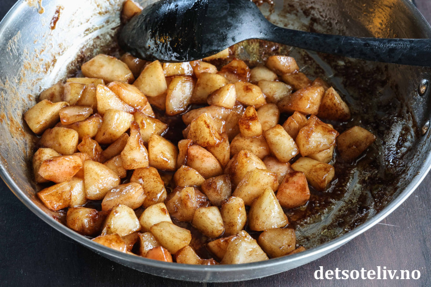 La eplebitene stekes på middels varme i 3–4 minutter, til de blir møre og lett karamelliserte. Avkjøl.
