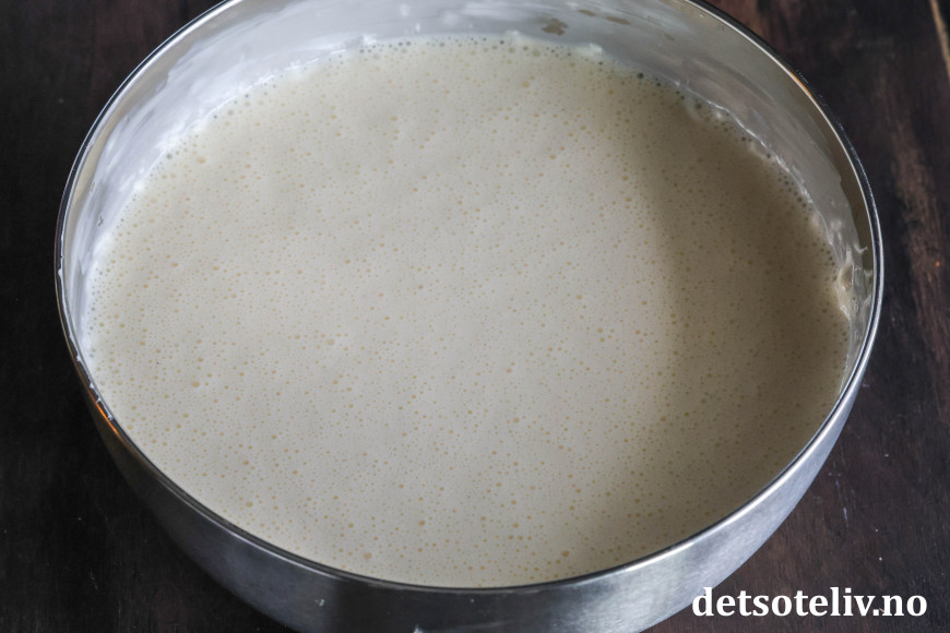 Pisk inn eggene, ett om gangen (se tips). Pisk deretter inn seterrømmen.