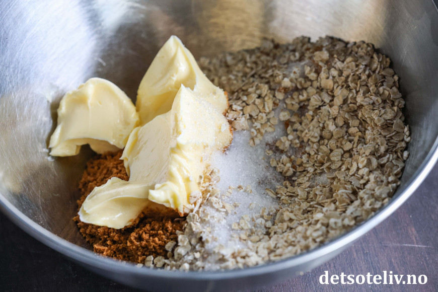 Ha kjekssmulene i en bolle sammen med havregryn, sukker og mykt, romtemperert smør.