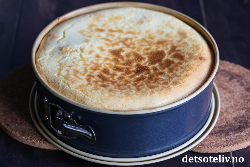 ♥ Ostekaken skal stekes lenge på forholdsvis lav varme for å unngå at den sprekker opp på overflaten. Av samme grunn skal den stå i ettervarmen i ovnen i 20 minutter, og så gradvis avkjøles i romtemperatur før den settes i kjøleskapet.