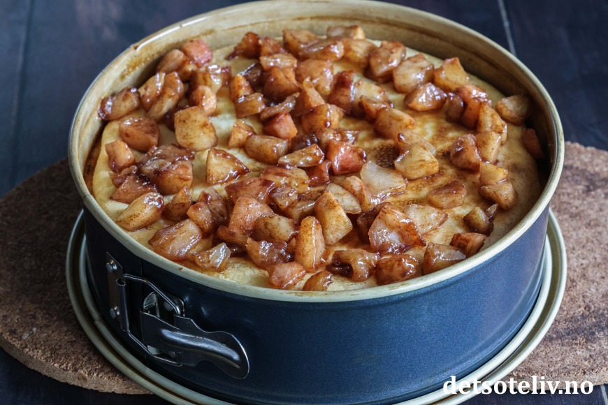 De karamelliserte eplebitene gjør seg veldig godt i denne kaken her!