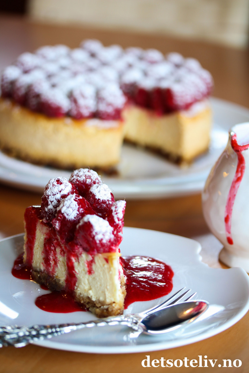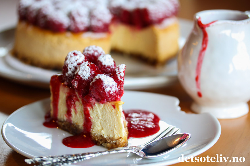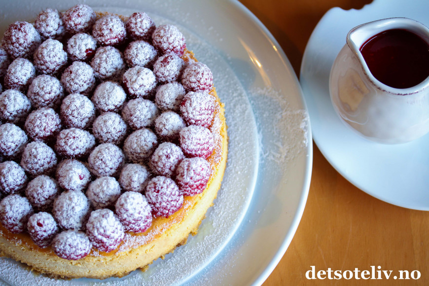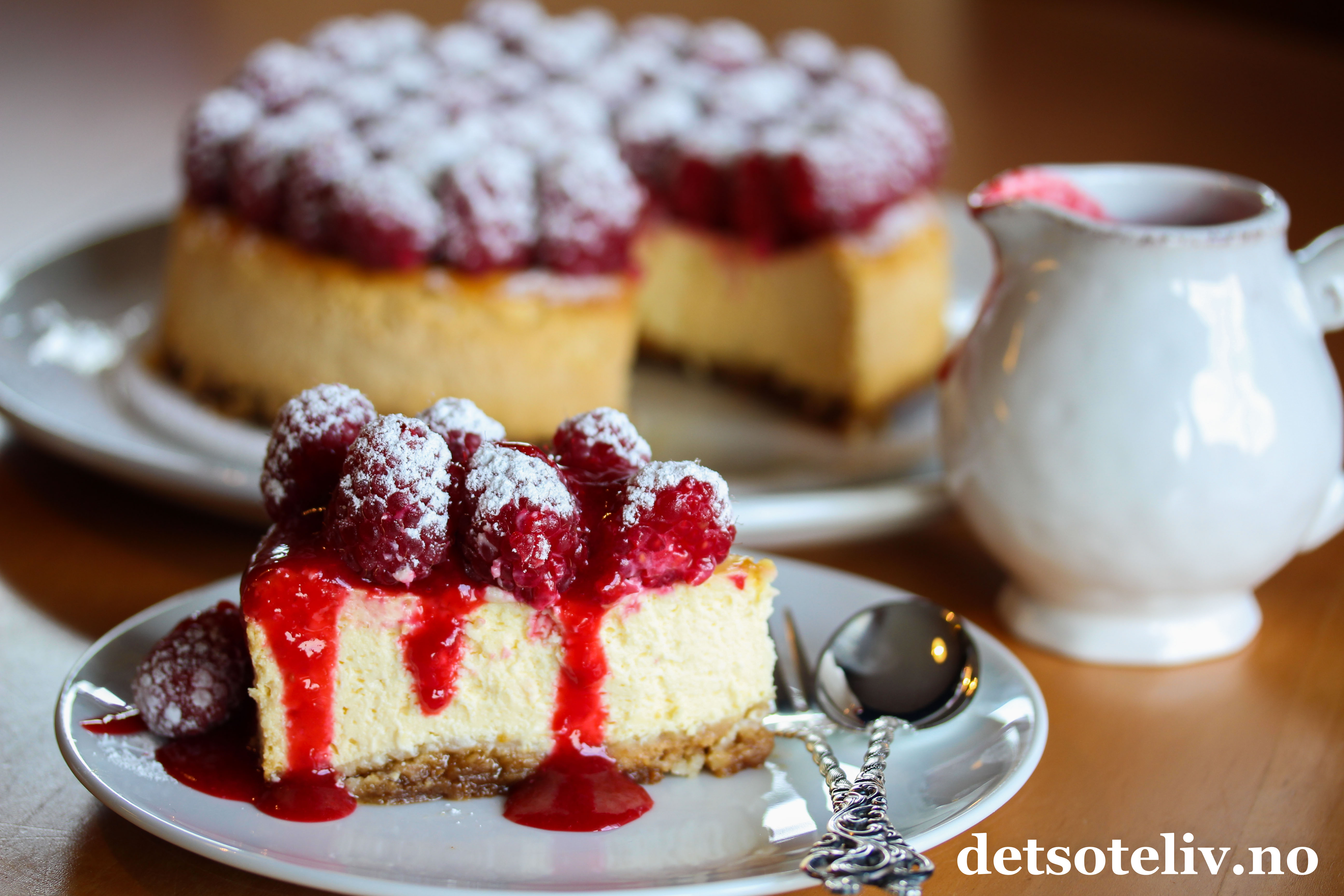 Bringebærcoulis er perfekt følge til denne deilige ostekaken!