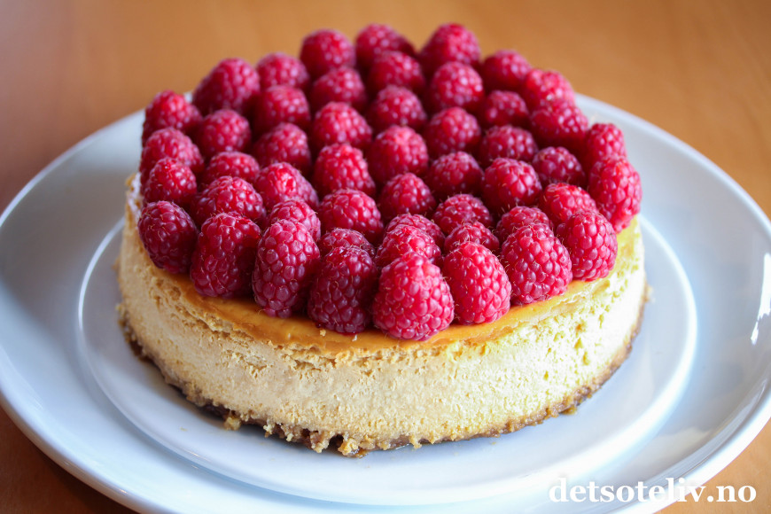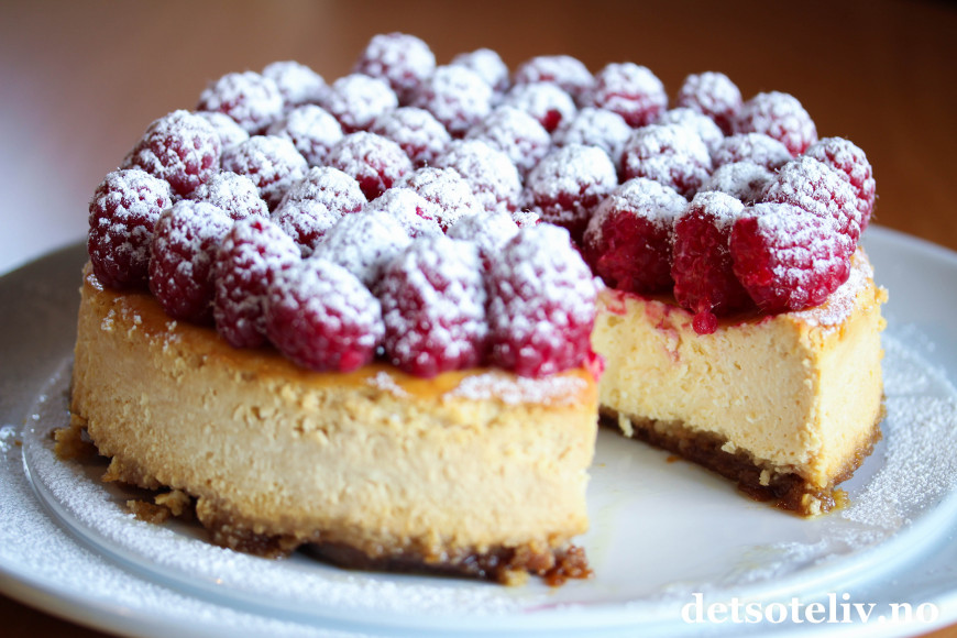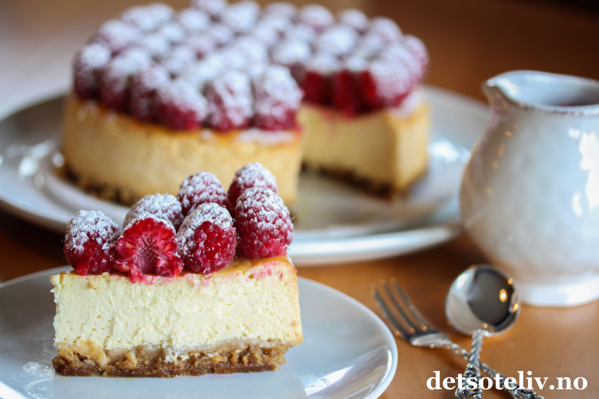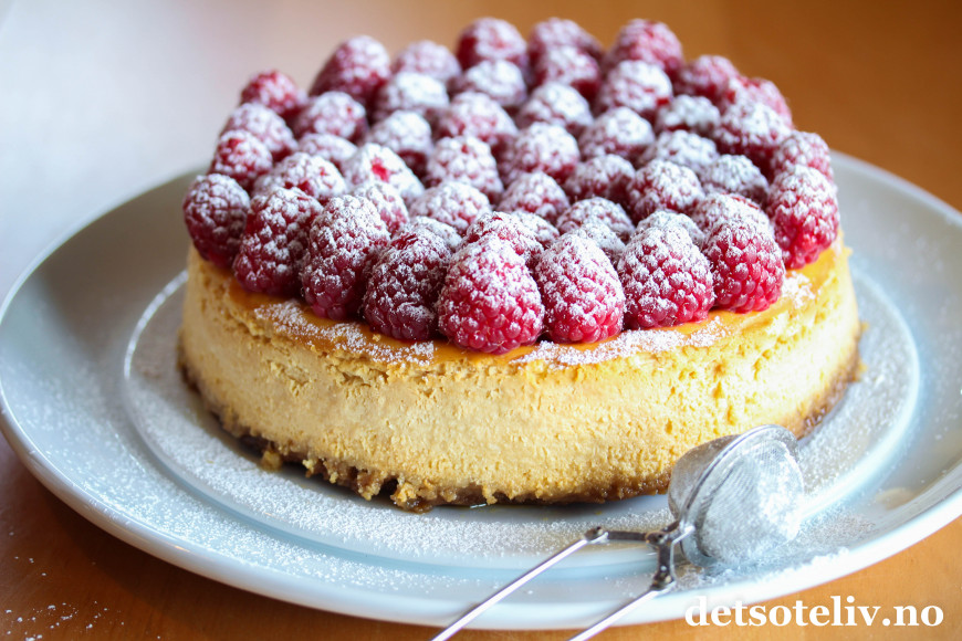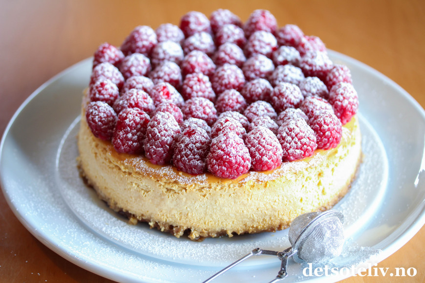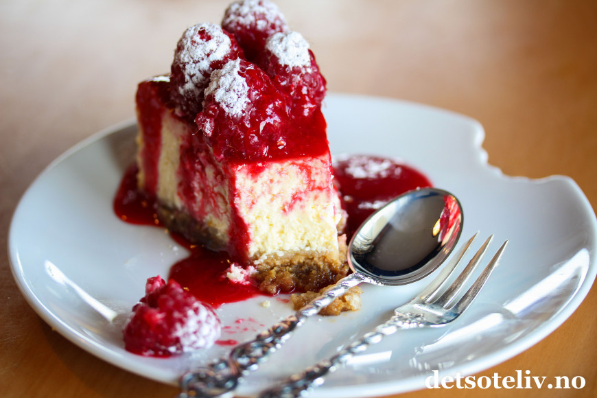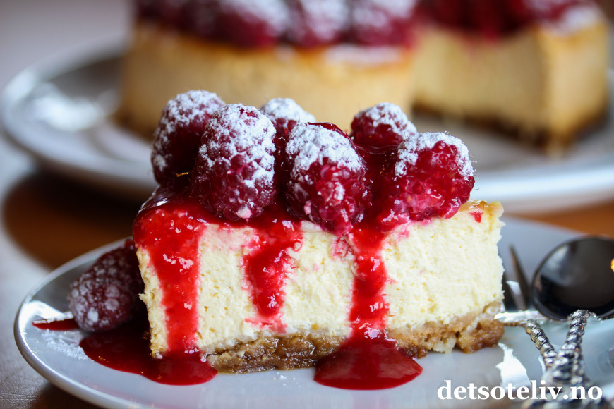 Bringebærcoulis er perfekt følge til denne deilige ostekaken!