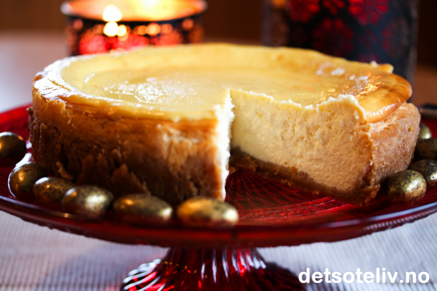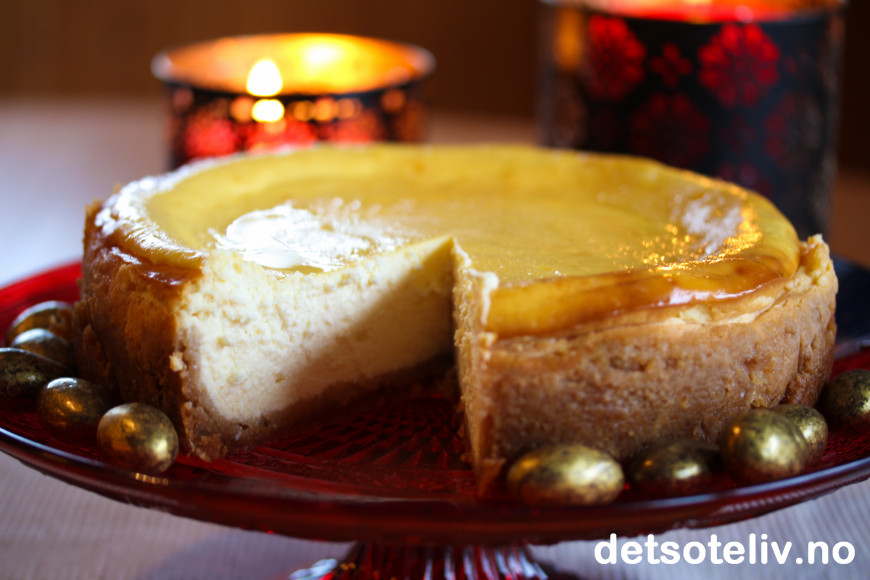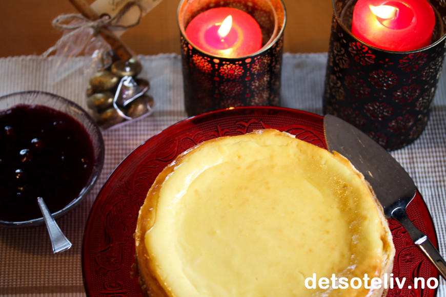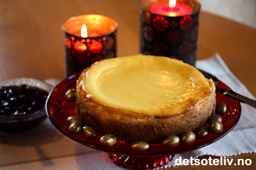 ♥ Merk at denne ostekaken trenger lang steketid på svak varme. Da blir kaken skånsomt stekt og du unngår at den sprekker på toppen.