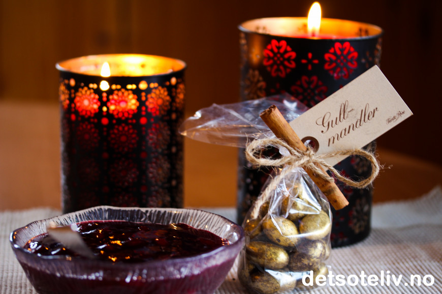Jeg pyntet kakefatet med lekre gullfargede sjokolademandler, som jeg synes er utrolig fine.