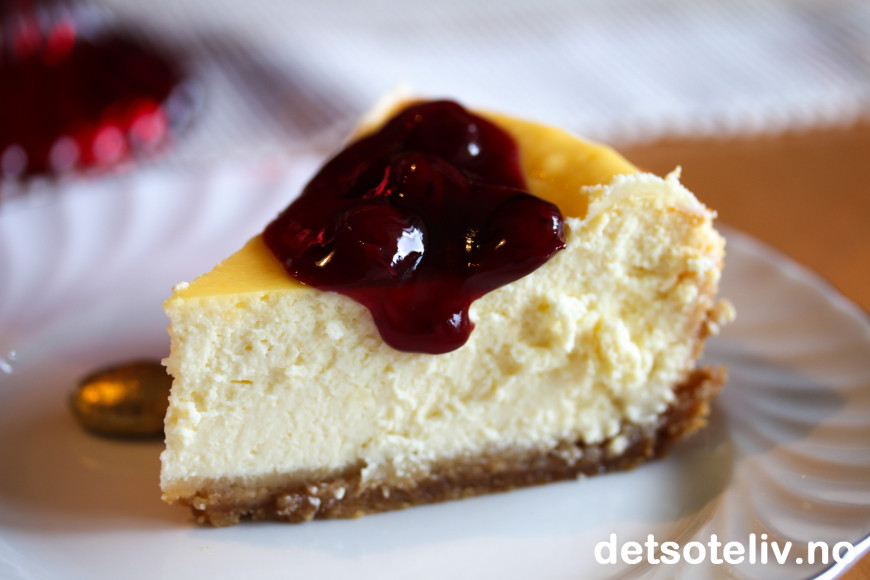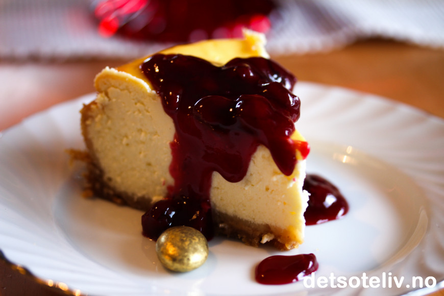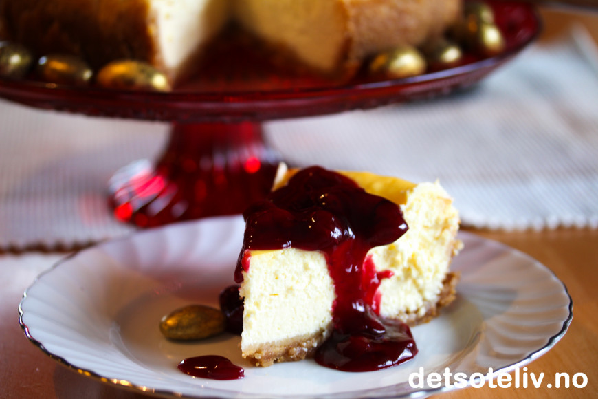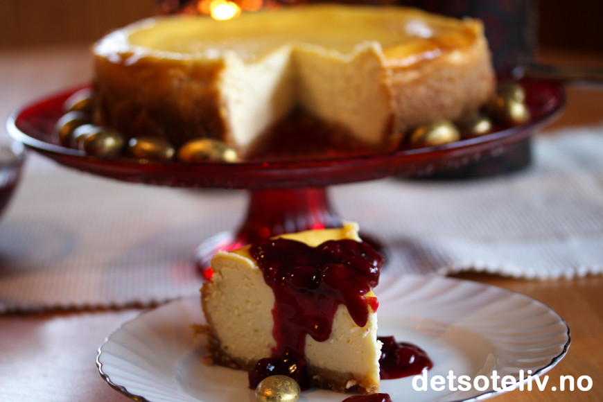 Lekkert med rød kirsebærsaus på den hvite ostekaken nå i disse juletider - og smakene harmonerer nydelig sammen!