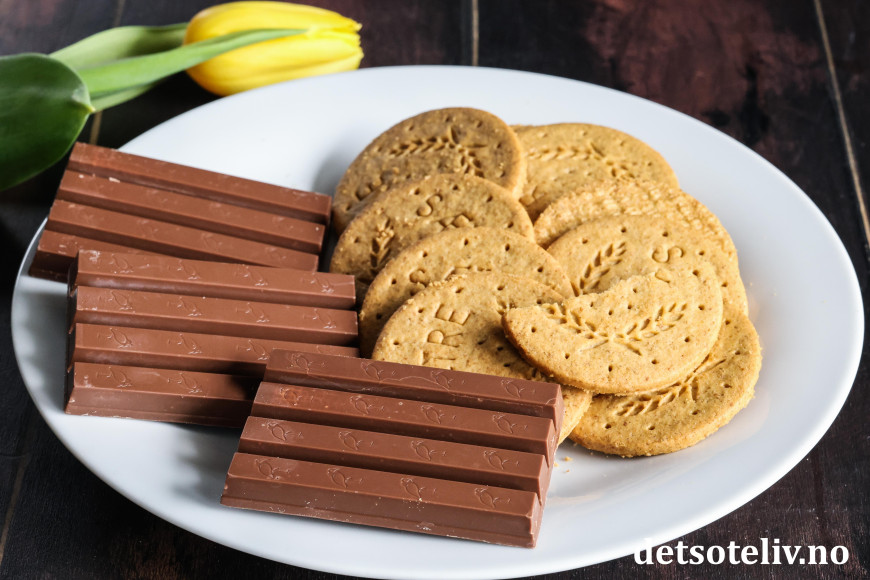 Finn frem Kvikk Lunsj og Digestive-kjeks.
