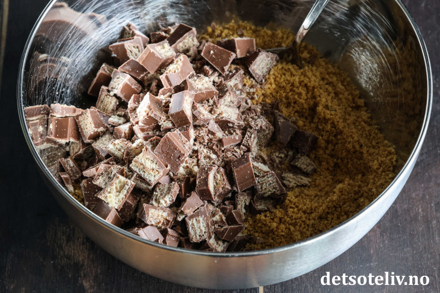 Finn frem Kvikk Lunsj og Digestive-kjeks. Hakk opp Kvikk Lunsj og knust Digestive-kjeksene til fine smuler (gjøres raskt i food processor). Ha kjekssmulene og hakket Kvikk Lunsj i en bolle. Rør dette sammen med smeltet smør.