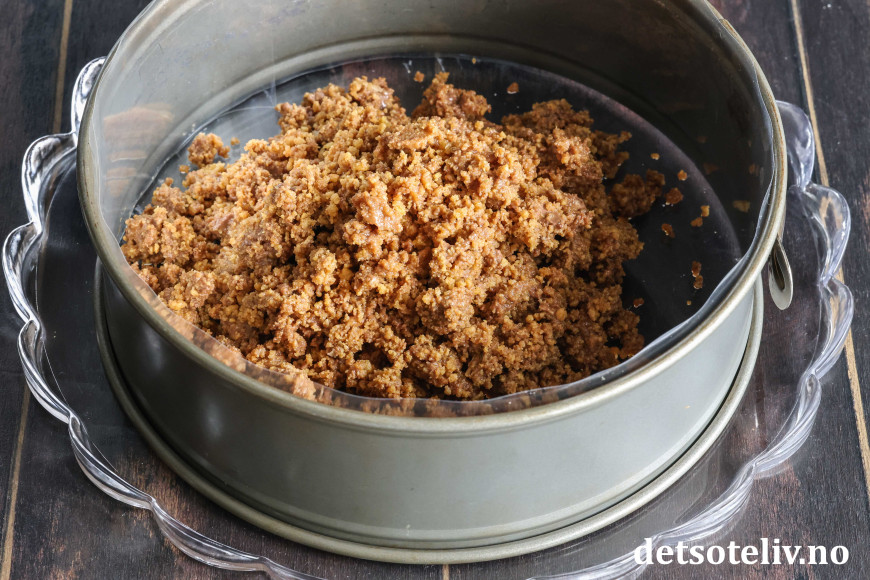 Sett kakeringen til en rund kakeform (24 cm i diameter) direkte på et kakefat. Press kjeksmassen utover i et jevnt lag. Vær nøye på at kjeksmassen går helt ut til kakeringen slik at det ikke blir noen sprekker.