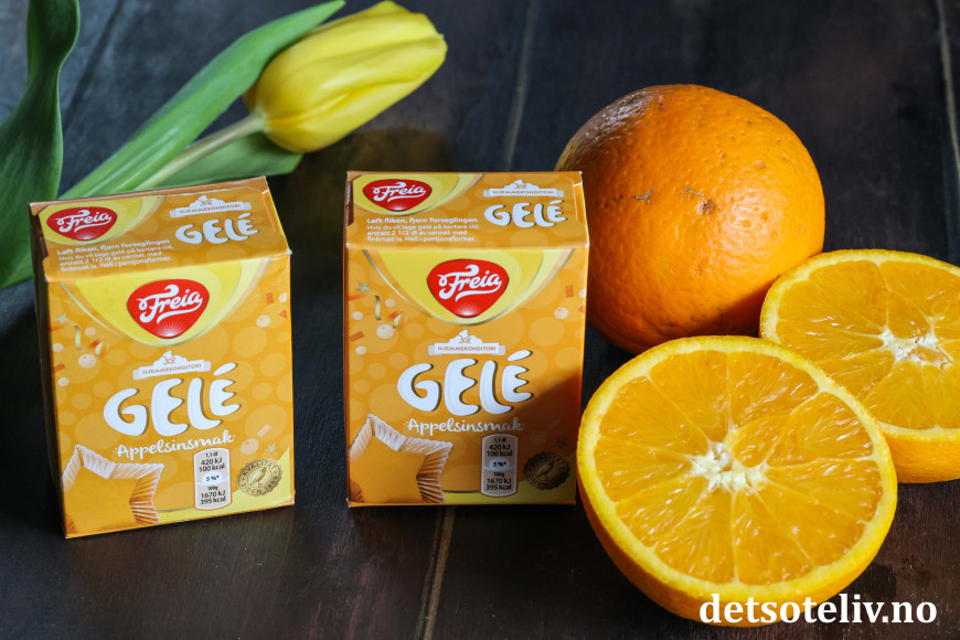 Press saft fra appelsinene. Sil saften og mål opp 2 dl. Ha dette i en liten kjele sammen med litt vann. Gi blandingen et oppkok. Ta kjelen av platen og tilsett appelsingelépulveret. Rør til gelépulveret har løst seg opp.