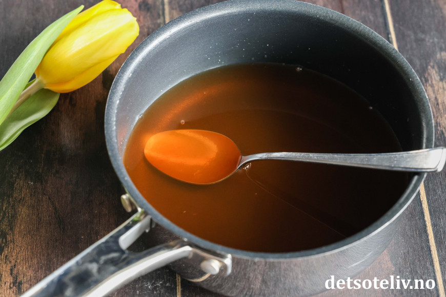Press saft fra appelsinene. Sil saften og mål opp 2 dl. Ha dette i en liten kjele sammen med litt vann.