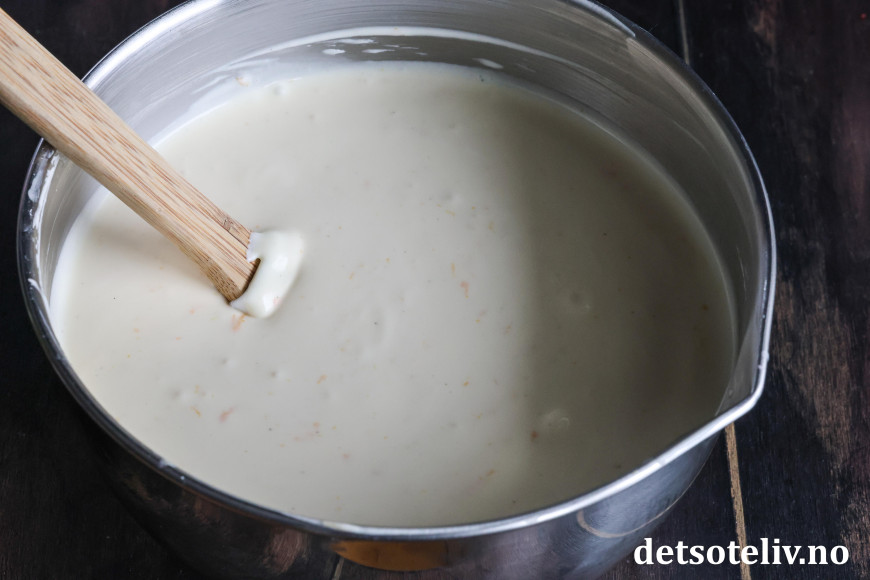 Sett fatet i kjøleskapet (4–6 timer, eller over natten) slik at ostefromasjen stivner.