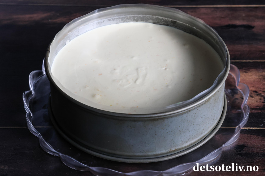 Hell fyllet over kjeksbunnen i kakeformen. Sett fatet i kjøleskapet (4–6 timer, eller over natten) slik at ostefromasjen stivner.