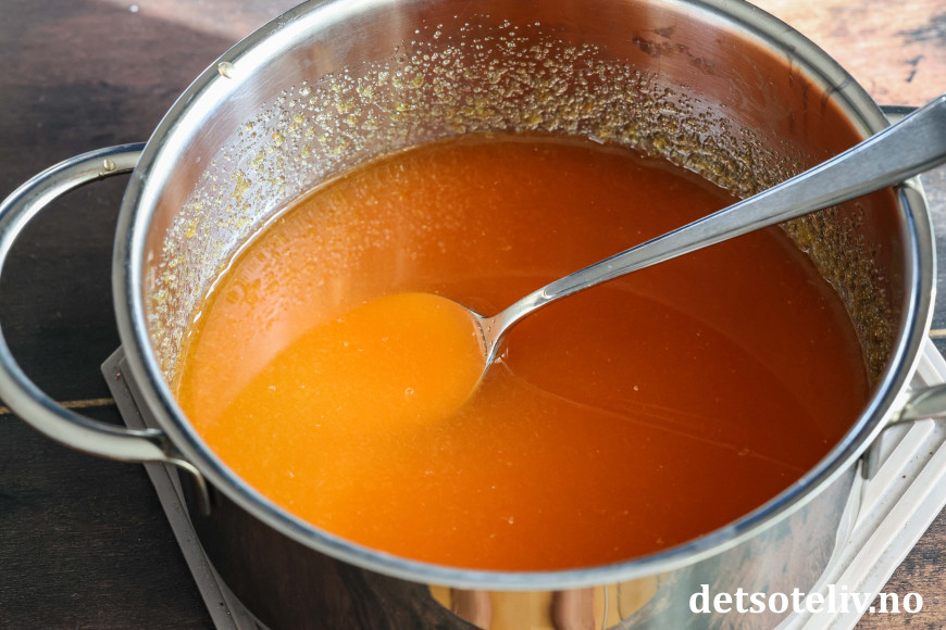 Gi blandingen et oppkok. Ta kjelen av platen og tilsett appelsingelépulveret. Rør til gelépulveret har løst seg opp.