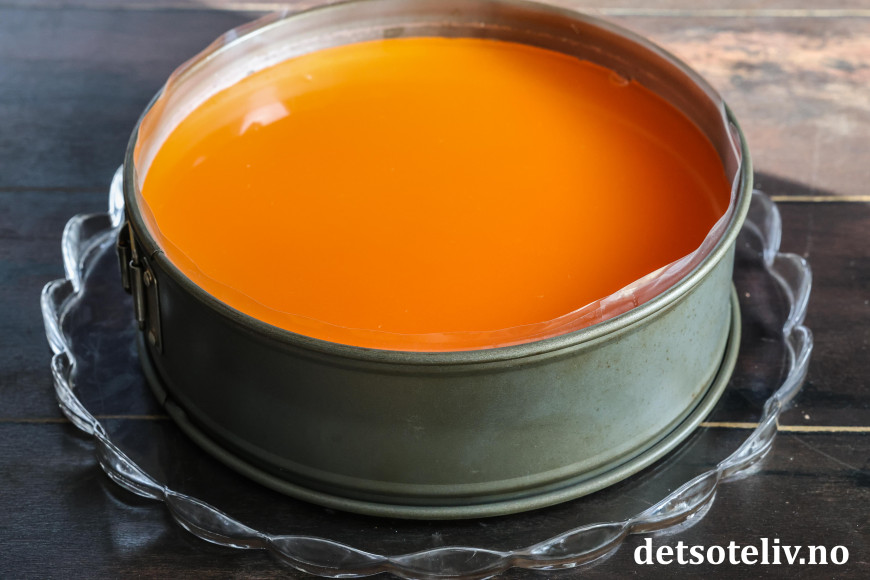 Avkjøl til geléen er kald, men fortsatt flytende. Hell den så forsiktig over kaken i formen. Sett kaken tilbake i kjøleskapet til gelélokket har stivnet.