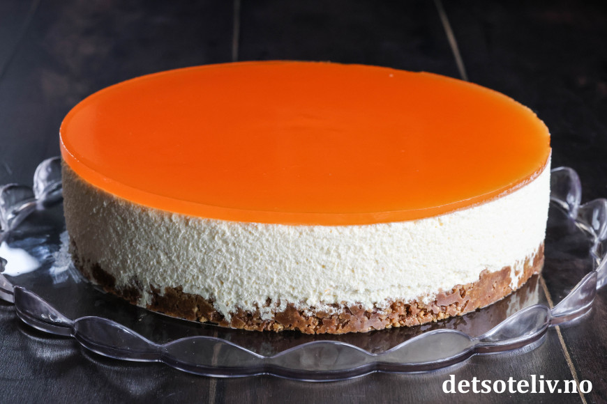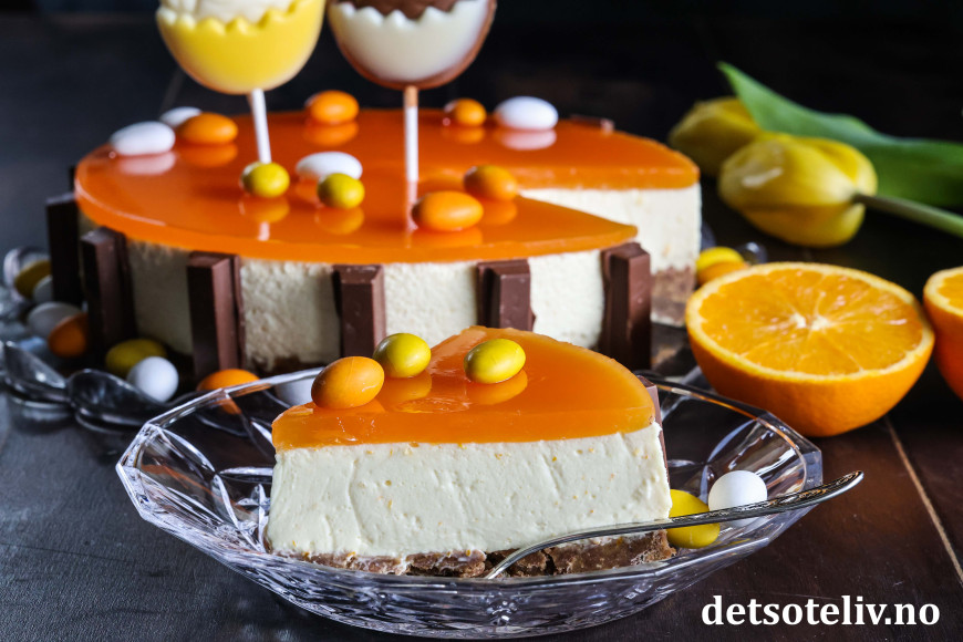 Ostekaken har hakket Kvikk Lunsj i kjeksbunnen, som gjør den ekstra god. Ostefromasjen får nydelig smak av appelsin ved at den inneholder både appelsingelé og revet appelsinskall. Gelélokket lages med appelsingelé blandet med ferskpresset appelsinsaft.