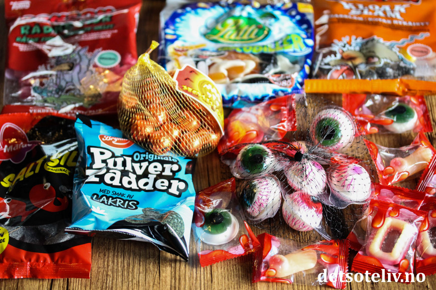 ♥ Bruk Halloween-godteri i de variantene som du får tak i. Jeg kjøpte mesteparten hos Nille. Det gjelder også de oransje lyslenkene som du ser rundt kaken på bildene.