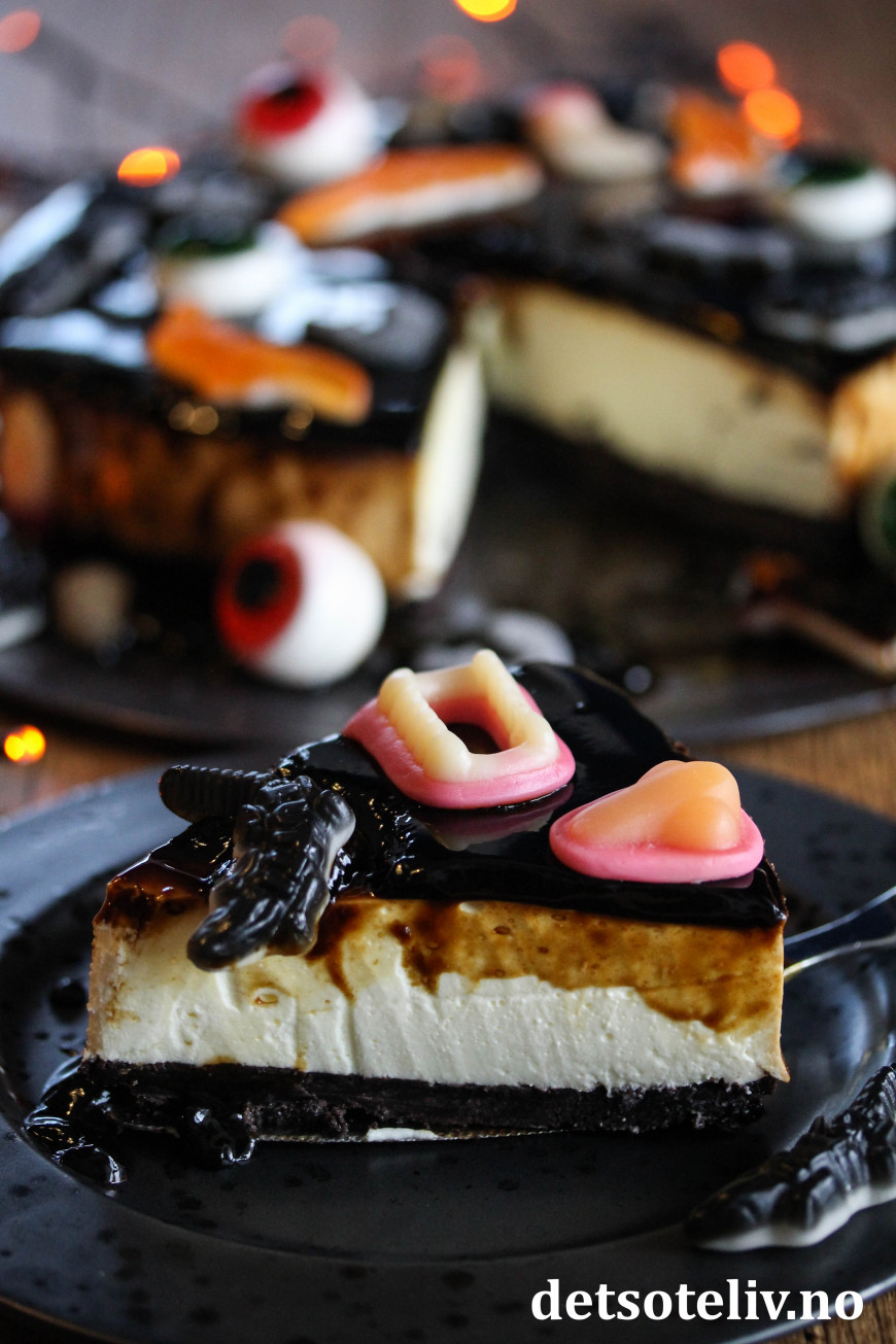 Jeg har brukt Oreokjeks i kakebunnen for å få den sort. Fyllet har jeg beholdt helt klassisk. På toppen har jeg laget en sort gelé av lakrissirup og lagt på forskjellig Halloween-godteri.