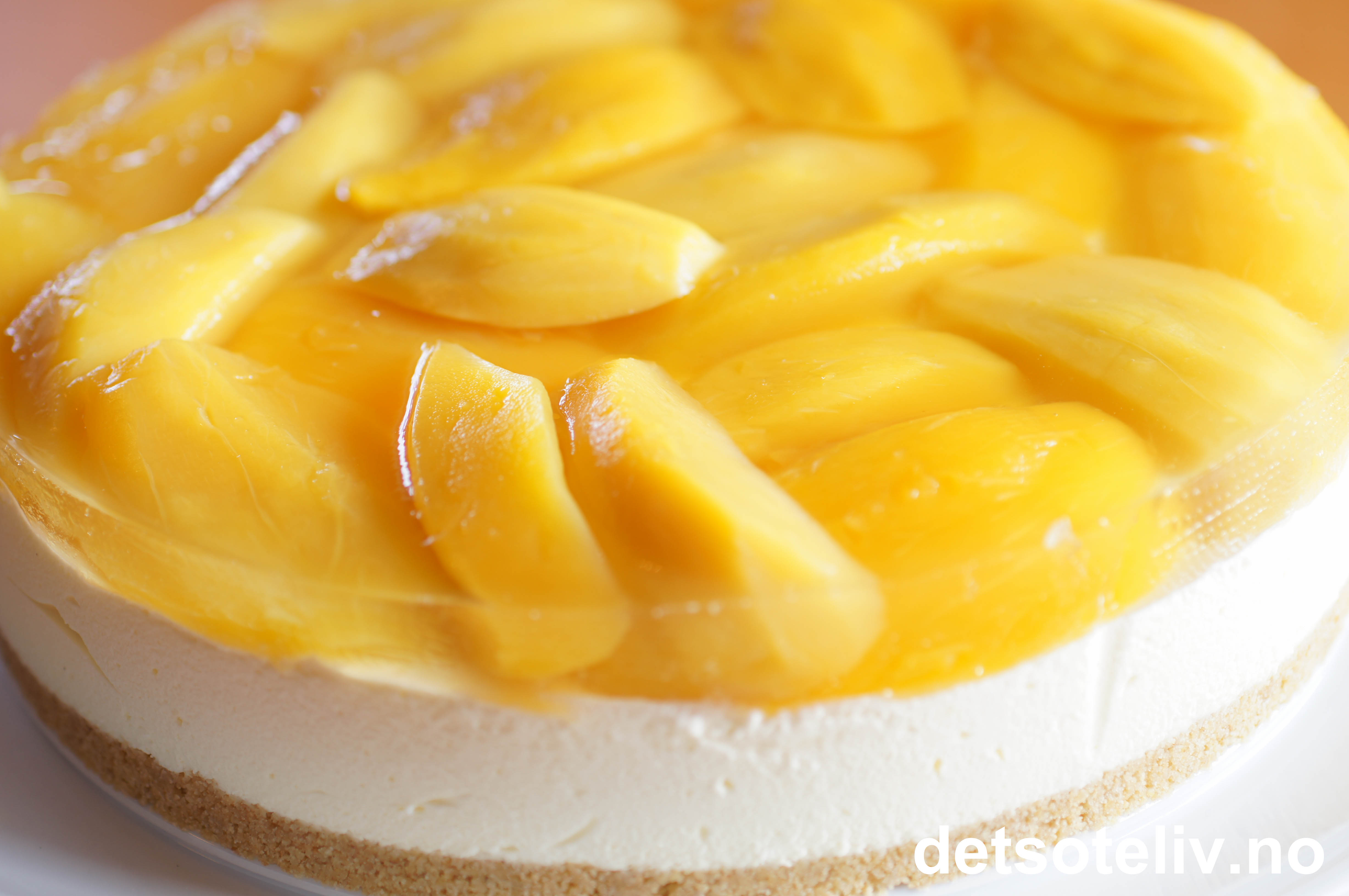 La mango renne av seg i en sikt, men spar på 3 dl av laken. Legg mangoskiver på toppen av ostekaken. Legg gelatinplater i bløt i kaldt vann i 5 min. Varm imens opp mangolaken i en liten kjele. Klem vannet ut av gelatinplatene og løs opp i den varme mangolaken. La blandingen avkjøle i romtemperatur. Når den er avkjølt (men fortsatt helt flytende), øses laken forsiktig over mangoen på ostekaken. Sett ostekaken tilbake i kjøleskapet et par timer til laken har stivnet helt.