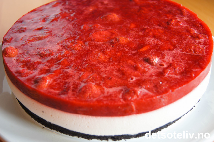 Hei. Jeg lagde ostekaken som i oppskriften. Kjeksbunnen og selve kaken ble super bra (sto i kjøleskapet ca. 6 timer) - helt til jeg skulle lage jordbær lokket....da gikk det galt! Jeg varmet opp Noras rørte syltetøy, og 400 g frosne jordbær + 2 pakker jordbærgele. Helte det hele over kaken etter avkjøling, og morgenen etter rant alt utover kaken - ikke noe stivt. Så ut som jeg hadde kastet et halvt glass med syltetøy på......